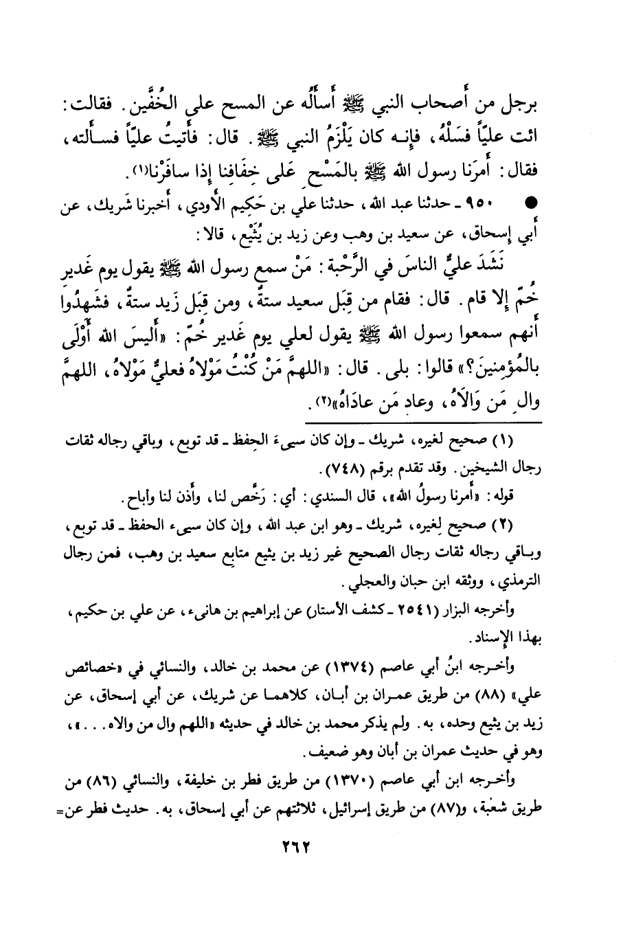• ٩٥٠ - حَدَّثَنَا عَبْدُ اللهِ، حَدَّثَنَا عَلِيُّ بْنُ حَكِيمٍ الْأَوْدِيُّ، أَخْبَرَنَا شَرِيكٌ، عَنْ أَبِي إِسْحَاقَ، عَنْ سَعِيدِ بْنِ وَهْبٍ، وَعَنْ زَيْدِ بْنِ يُثَيْعٍ، قَالا: نَشَدَ عَلِيٌّ النَّاسَ فِي الرَّحَبَةِ: مَنْ سَمِعَ رَسُولَ اللهِ صَلَّى اللهُ عَلَيْهِ وَسَلَّمَ يَقُولُ يَوْمَ غَدِيرِ خُمٍّ إِلا قَامَ، قَالَ: فَقَامَ مِنْ قِبَلِ سَعِيدٍ سِتَّةٌ، وَمِنْ قِبَلِ زَيْدٍ سِتَّةٌ، فَشَهِدُوا أَنَّهُمْ سَمِعُوا رَسُولَ اللهِ صَلَّى اللهُ عَلَيْهِ وَسَلَّمَ يَقُولُ لِعَلِيٍّ يَوْمَ غَدِيرِ خُمٍّ: " أَلَيْسَ اللهُ أَوْلَى بِالْمُؤْمِنِينَ؟ " قَالُوا: بَلَى قَالَ: " اللهُمَّ مَنْ كُنْتُ مَوْلاهُ، فَعَلِيٌّ مَوْلاهُ، اللهُمَّ وَالِ مَنْ وَالاهُ، وَعَادِ مَنْ عَادَاهُ " (٢)