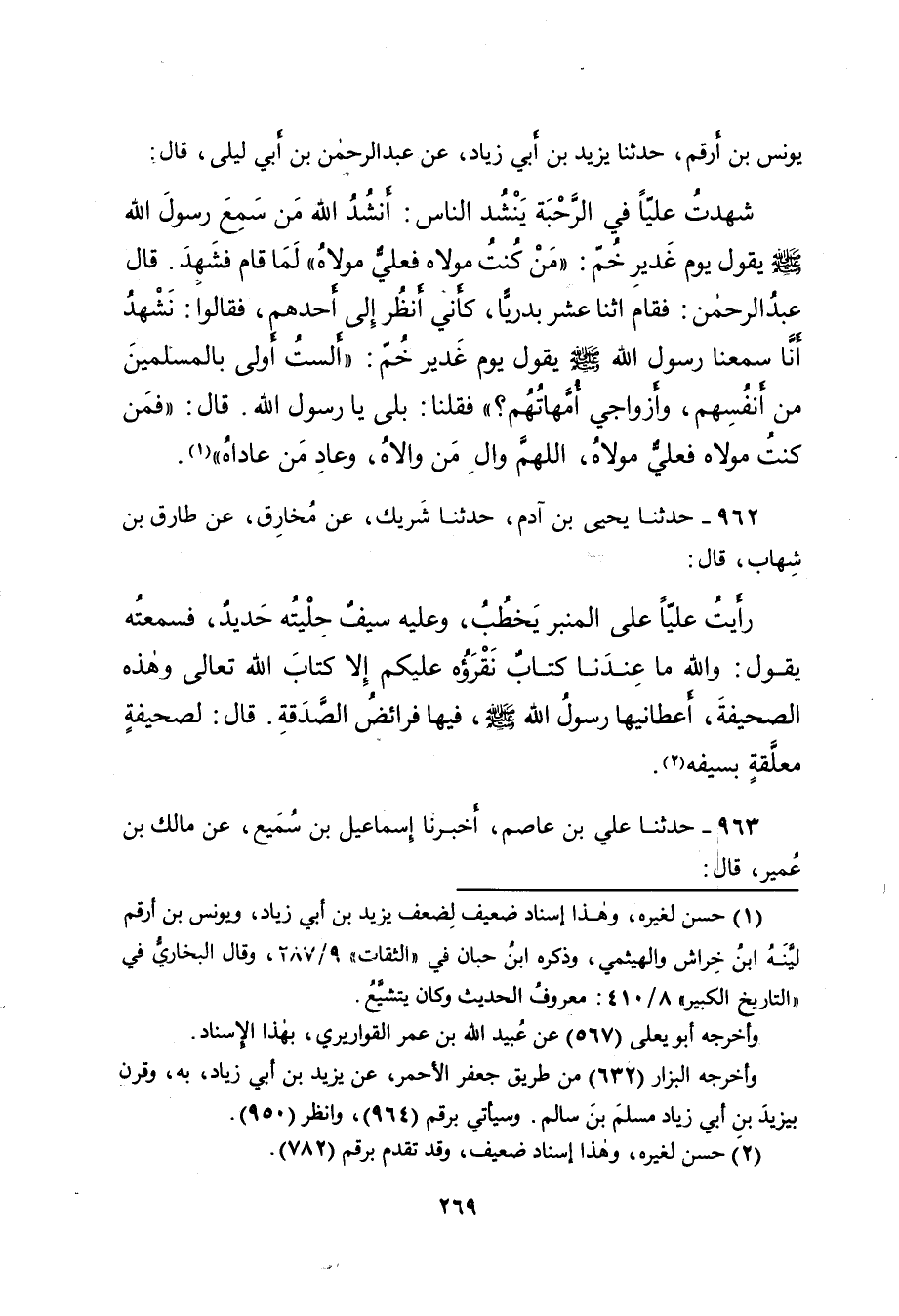 يُونُسُ بْنُ أَرْقَمَ، حَدَّثَنَا يَزِيدُ بْنُ أَبِي زِيَادٍ، عَنْ عَبْدِ الرَّحْمَنِ بْنِ أَبِي لَيْلَى، قَالَ: شَهِدْتُ عَلِيًّا، فِي الرَّحَبَةِ يَنْشُدُ النَّاسَ: أَنْشُدُ اللهَ مَنْ سَمِعَ رَسُولَ اللهِ صَلَّى اللهُ عَلَيْهِ وَسَلَّمَ يَقُولُ يَوْمَ غَدِيرِ خُمٍّ: " مَنْ كُنْتُ مَوْلَاهُ فَعَلِيٌّ مَوْلَاهُ " لَمَّا قَامَ فَشَهِدَ، قَالَ عَبْدُ الرَّحْمَنِ: فَقَامَ اثْنَا عَشَرَ بَدْرِيًّا، كَأَنِّي أَنْظُرُ إِلَى أَحَدِهِمْ، فَقَالُوا: نَشْهَدُ أَنَّا سَمِعْنَا رَسُولَ اللهِ صَلَّى اللهُ عَلَيْهِ وَسَلَّمَ يَقُولُ يَوْمَ غَدِيرِ خُمٍّ: " أَلَسْتُ أَوْلَى بِالْمُسْلِمِينَ مِنْ أَنْفُسِهِمْ، وَأَزْوَاجِي أُمَّهَاتُهُمْ؟ " فَقُلْنَا: بَلَى يَا رَسُولَ اللهِ، قَالَ: " فَمَنْ كُنْتُ مَوْلَاهُ فَعَلِيٌّ مَوْلَاهُ، اللهُمَّ وَالِ مَنْ وَالَاهُ، وَعَادِ مَنْ عَادَاهُ " (١)