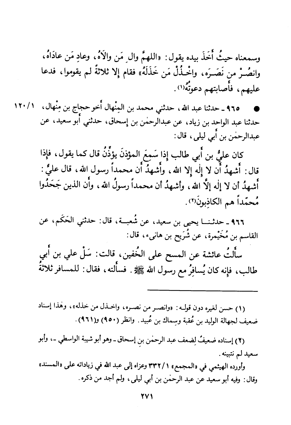 • ٩٦٥ - حَدَّثَنَا عَبْدُ اللهِ، حَدَّثَنِي مُحَمَّدُ بْنُ الْمِنْهَالِ، أَخُو حَجَّاجِ بْنِ مِنْهَالٍ، حَدَّثَنَا عَبْدُ الْوَاحِدِ بْنُ زِيَادٍ، عَنْ عَبْدِ الرَّحْمَنِ بْنِ إِسْحَاقَ، حَدَّثَنِي أَبُو سَعِيدٍ، عَنْ عَبْدِ الرَّحْمَنِ بْنِ أَبِي لَيْلَى، قَالَ: كَانَ عَلِيُّ بْنُ أَبِي طَالِبٍ إِذَا سَمِعَ الْمُؤَذِّنَ يُؤَذِّنُ قَالَ كَمَا يَقُولُ، فَإِذَا قَالَ: أَشْهَدُ أَنْ لَا إِلَهَ إِلا اللهُ، وَأَشْهَدُ أَنَّ مُحَمَّدًا رَسُولُ اللهِ، قَالَ عَلِيٌّ: " أَشْهَدُ أَنْ لَا إِلَهَ إِلا اللهُ، وَأَشْهَدُ أَنَّ مُحَمَّدًا رَسُولُ اللهِ، وَأَنَّ الَّذِينَ جَحَدُوا مُحَمَّدًا هُمِ الْكَاذِبُونَ " (٢)
