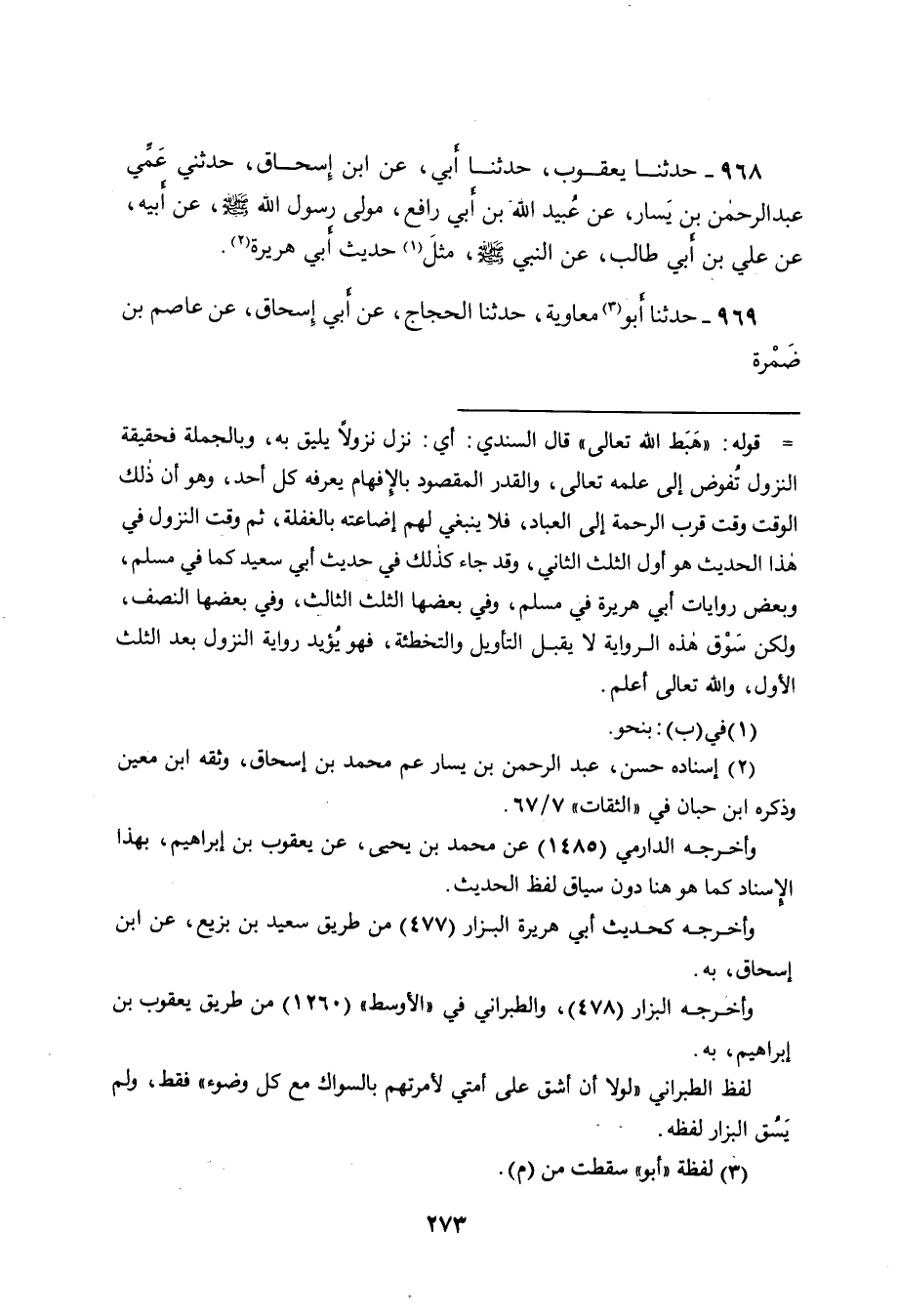 ٩٦٨ - حَدَّثَنَا يَعْقُوبُ، حَدَّثَنَا أَبِي، عَنِ ابْنِ إِسْحَاقَ، حَدَّثَنِي عَمِّي عَبْدُ الرَّحْمَنِ بْنُ يَسَارٍ، عَنْ عُبَيْدِ اللهِ بْنِ أَبِي رَافِعٍ، مَوْلَى رَسُولِ اللهِ صَلَّى اللهُ عَلَيْهِ وَسَلَّمَ عَنْ أَبِيهِ، عَنْ عَلِيِّ بْنِ أَبِي طَالِبٍ، عَنِ النَّبِيِّ صَلَّى اللهُ عَلَيْهِ وَسَلَّمَ مِثْلَ (١) حَدِيثِ أَبِي هُرَيْرَةَ (٢)