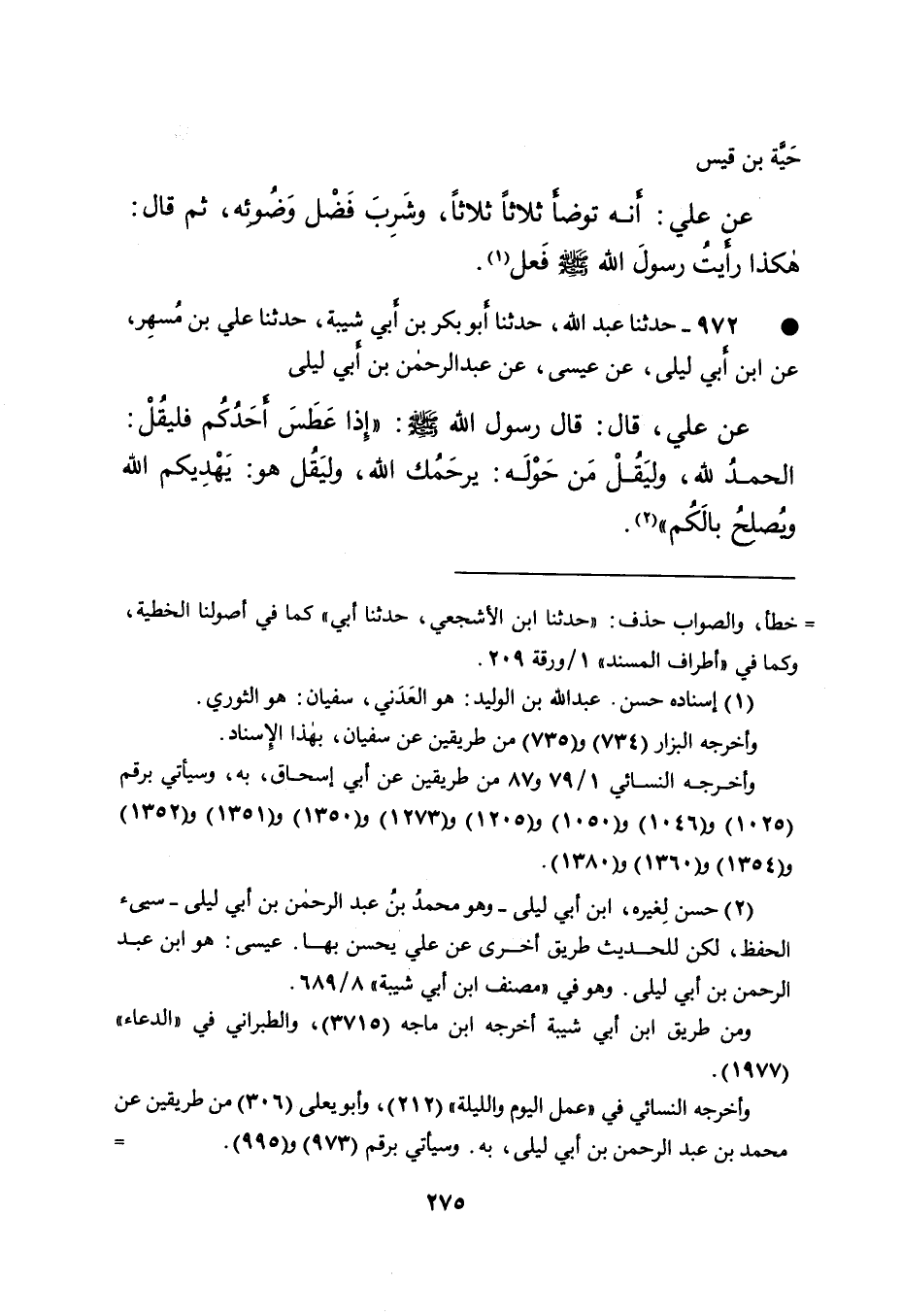• ٩٧٢ - حَدَّثَنَا عَبْدُ اللهِ، حَدَّثَنَا أَبُو بَكْرِ بْنُ أَبِي شَيْبَةَ، حَدَّثَنَا عَلِيُّ بْنُ مُسْهِرٍ، عَنِ ابْنِ أَبِي لَيْلَى، عَنْ عِيسَى، عَنْ عَبْدِ الرَّحْمَنِ بْنِ أَبِي لَيْلَى، عَنْ عَلِيٍّ، قَالَ: قَالَ رَسُولُ اللهِ صَلَّى اللهُ عَلَيْهِ وَسَلَّمَ: " إِذَا عَطَسَ أَحَدُكُمْ فَلْيَقُلْ: الْحَمْدُ لِلَّهِ رَبِّ الْعَالَمِينَ، وَلْيَقُلْ مَنْ حَوْلَهُ: يَرْحَمُكَ اللهُ، وَلْيَقُلْ هُوَ: يَهْدِيكُمُ اللهُ وَيُصْلِحُ بَالَكُمْ " (٢)