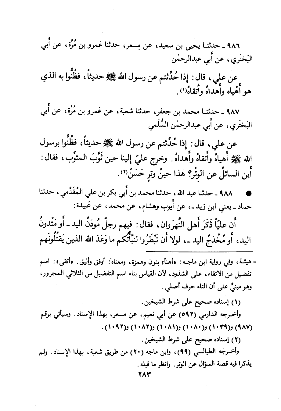 ٩٨٧ - حَدَّثَنَا مُحَمَّدُ بْنُ جَعْفَرٍ، حَدَّثَنَا شُعْبَةُ، عَنْ عَمْرِو بْنِ مُرَّةَ، عَنْ أَبِي الْبَخْتَرِيِّ، عَنْ أَبِي عَبْدِ الرَّحْمَنِ السُّلَمِيِّ، عَنْ عَلِيٍّ، قَالَ: " إِذَا حُدِّثْتُمْ عَنْ رَسُولِ اللهِ صَلَّى اللهُ عَلَيْهِ وَسَلَّمَ حَدِيثًا، فَظُنُّوا بِرَسُولِ اللهِ صَلَّى اللهُ عَلَيْهِ وَسَلَّمَ أَهْيَاهُ، وَأَتْقَاهُ، وَأَهْدَاهُ "، وَخَرَجَ عَلِيٌّ إِلَيْنَا حِينَ ثَوَّبَ الْمُثَوِّبُ، فَقَالَ: " أَيْنَ السَّائِلُ عَنِ الْوِتْرِ؟ هَذَا حِينُ وِتْرٍ حَسَنٍ " (٢)