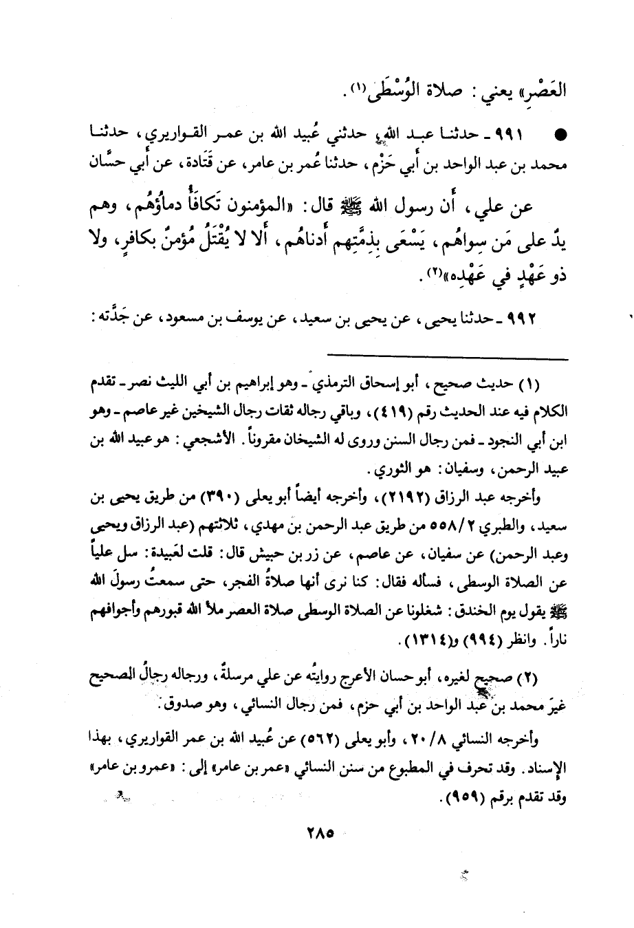 • ٩٩١ - حَدَّثَنَا عَبْدُ اللهِ، حَدَّثَنِي عُبَيْدُ اللهِ بْنُ عُمَرَ الْقَوَارِيرِيُّ، حَدَّثَنَا مُحَمَّدُ بْنُ عَبْدِ الْوَاحِدِ بْنِ أَبِي حَزْمٍ، حَدَّثَنَا عُمَرُ بْنُ عَامِرٍ، عَنْ قَتَادَةَ، عَنْ أَبِي حَسَّانَ، عَنْ عَلِيٍّ، أَنَّ رَسُولَ اللهِ صَلَّى اللهُ عَلَيْهِ وَسَلَّمَ قَالَ: " الْمُؤْمِنُونَ تَكَافَأُ دِمَاؤُهُمْ، وَهُمْ يَدٌ عَلَى مَنْ سِوَاهُمْ، يَسْعَى بِذِمَّتِهِمْ أَدْنَاهُمْ، أَلا لَا يُقْتَلُ مُؤْمِنٌ بِكَافِرٍ، وَلا ذُو عَهْدٍ فِي عَهْدِهِ " (٢)