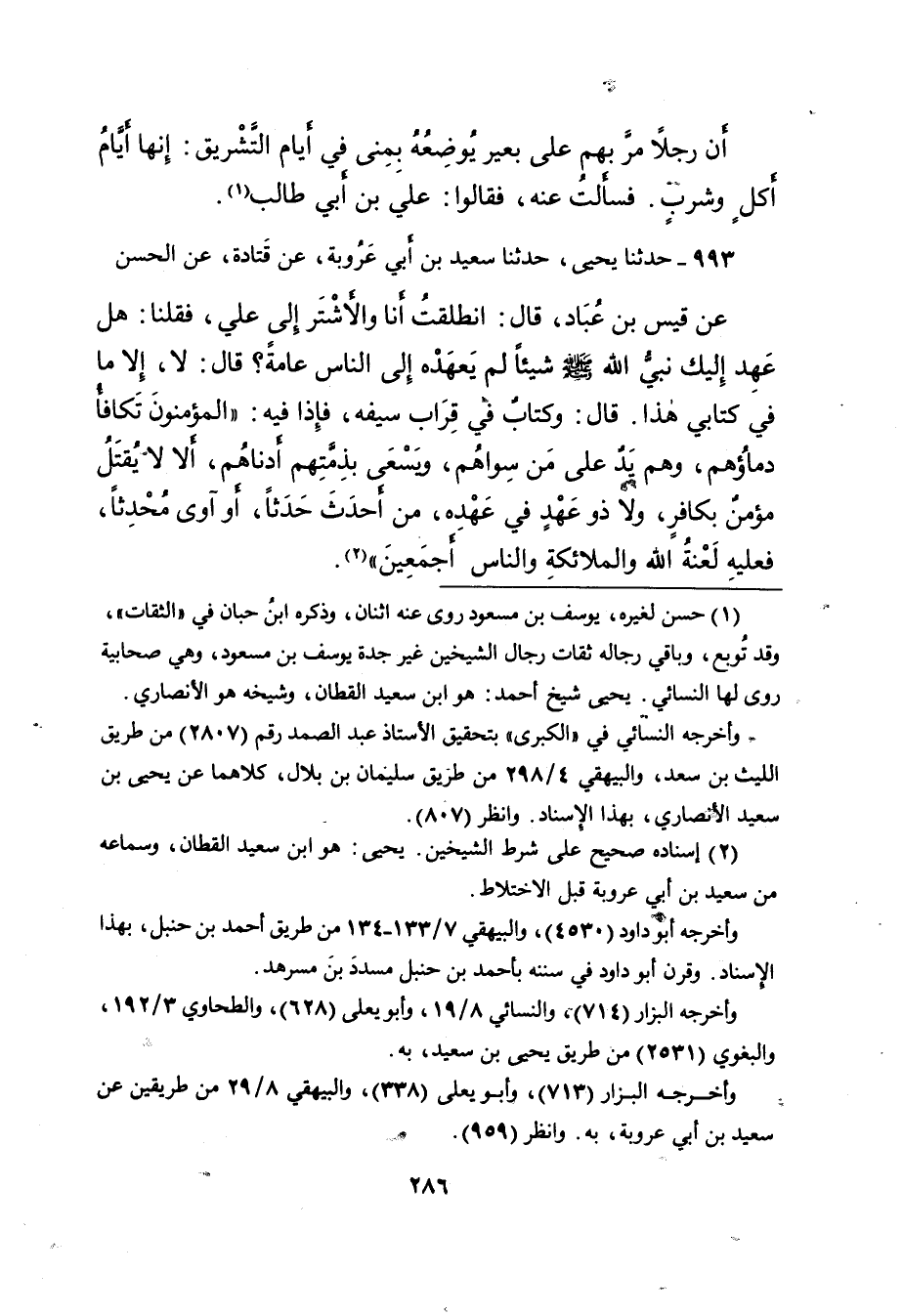 ٩٩٣ - حَدَّثَنَا يَحْيَى، حَدَّثَنَا سَعِيدُ بْنُ أَبِي عَرُوبَةَ، عَنْ قَتَادَةَ، عَنِ الْحَسَنِ، عَنْ قَيْسِ بْنِ عُبَادٍ، قَالَ: انْطَلَقْتُ أَنَا وَالْأَشْتَرُ، إِلَى عَلِيٍّ، فَقُلْنَا: هَلْ عَهِدَ إِلَيْكَ نَبِيُّ اللهِ صَلَّى اللهُ عَلَيْهِ وَسَلَّمَ شَيْئًا لَمْ يَعْهَدْهُ إِلَى النَّاسِ عَامَّةً؟ قَالَ: لَا، إِلا مَا فِي كِتَابِي هَذَا، قَالَ: وَكِتَابٌ فِي قِرَابِ سَيْفِهِ، فَإِذَا فِيهِ " الْمُؤْمِنُونَ تَكَافَأُ دِمَاؤُهُمْ، وَهُمْ يَدٌ عَلَى مَنْ سِوَاهُمْ، وَيَسْعَى بِذِمَّتِهِمْ أَدْنَاهُمْ، أَلا لَا يُقْتَلُ مُؤْمِنٌ بِكَافِرٍ، وَلا ذُو عَهْدٍ فِي عَهْدِهِ، مَنْ أَحْدَثَ حَدَثًا أَوْ آوَى مُحْدِثًا، فَعَلَيْهِ لَعْنَةُ اللهِ، وَالْمَلائِكَةِ وَالنَّاسِ أَجْمَعِينَ " (٢)