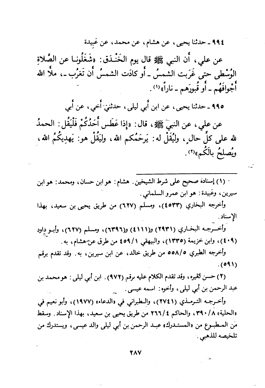 ٩٩٥ - حَدَّثَنَا يَحْيَى، عَنِ ابْنِ أَبِي لَيْلَى، حَدَّثَنِي أَخِي، عَنْ أَبِي، عَنْ عَلِيٍّ، عَنِ النَّبِيِّ صَلَّى اللهُ عَلَيْهِ وَسَلَّمَ قَالَ: " إِذَا عَطَسَ أَحَدُكُمْ فَلْيَقُلْ: الْحَمْدُ لِلَّهِ عَلَى كُلِّ حَالٍ، وَلْيُقَلْ لَهُ: يَرْحَمُكُمِ اللهُ، وَلْيَقُلْ هُوَ: يَهْدِيكُمُ اللهُ، وَيُصْلِحُ بَالَكُمْ " (٢)