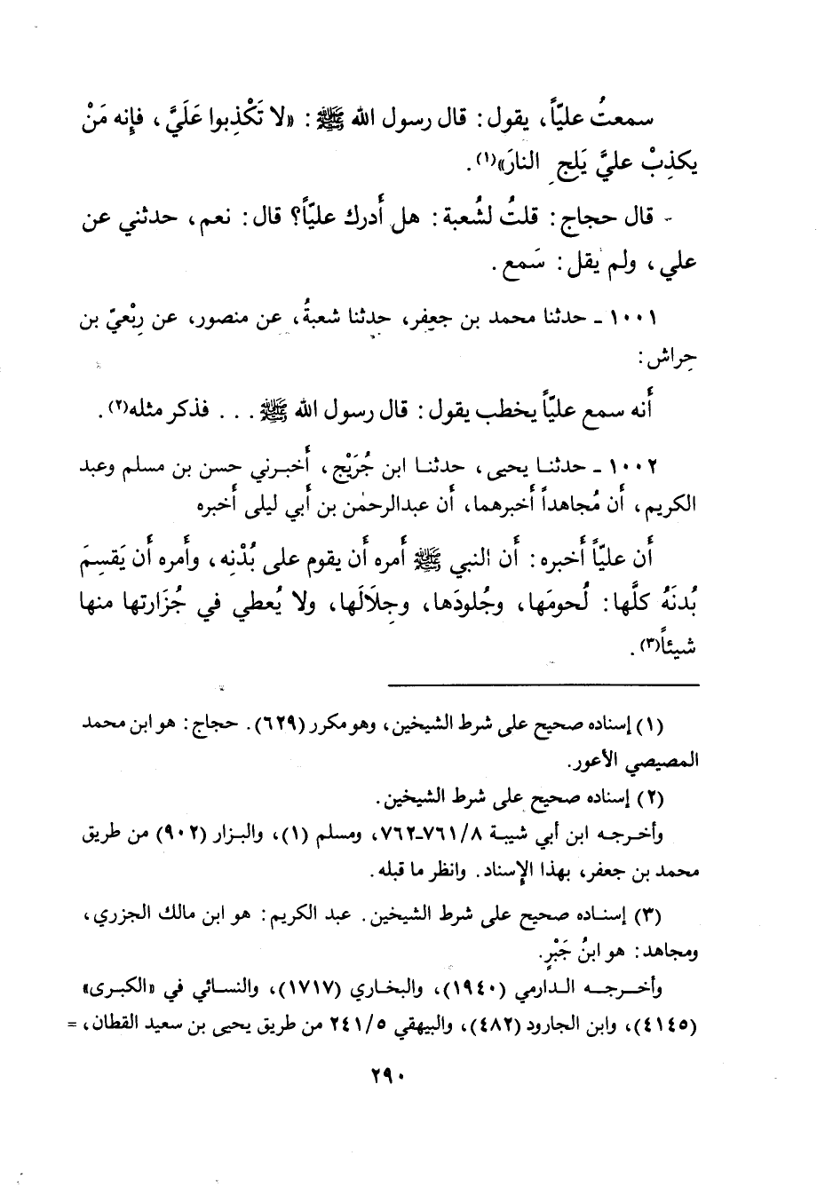 ١٠٠١ - حَدَّثَنَا مُحَمَّدُ بْنُ جَعْفَرٍ، حَدَّثَنَا شُعْبَةُ، عَنْ مَنْصُورٍ، عَنْ رِبْعِيِّ بْنِ حِرَاشٍ، أَنَّهُ سَمِعَ عَلِيًّا، يَخْطُبُ يَقُولُ: قَالَ رَسُولُ اللهِ صَلَّى اللهُ عَلَيْهِ وَسَلَّمَ: فَذَكَرَ مِثْلَهُ (٢)