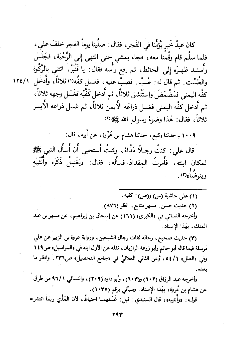 ١٠٠٩ - حَدَّثَنَا وَكِيعٌ، حَدَّثَنَا هِشَامُ بْنُ عُرْوَةَ، عَنْ أَبِيهِ، قَالَ: قَالَ عَلِيٌّ: كُنْتُ رَجُلًا مَذَّاءً وَكُنْتُ أَسْتَحِي أَنْ أَسْأَلَ النَّبِيَّ صَلَّى اللهُ عَلَيْهِ وَسَلَّمَ لِمَكَانِ ابْنَتِهِ فَأَمَرْتُ الْمِقْدَادَ فَسَأَلَهُ فَقَالَ: " يَغْسِلُ ذَكَرَهُ وَأُنْثَيَيْهِ وَيَتَوَضَّأُ " (٣)