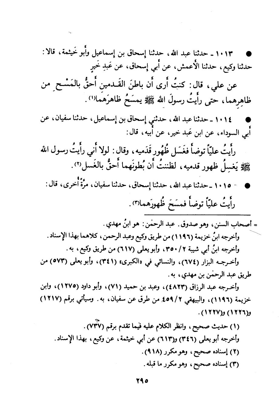 • ١٠١٣ - حَدَّثَنَا عَبْدُ اللهِ، حَدَّثَنَا إِسْحَاقُ بْنُ إِسْمَاعِيلَ، وَأَبُو خَيْثَمَةَ، قَالا: حَدَّثَنَا وَكِيعٌ، حَدَّثَنَا الْأَعْمَشُ، عَنْ أَبِي إِسْحَاقَ، عَنْ عَبْدِ خَيْرٍ، عَنْ عَلِيٍّ قَالَ: كُنْتُ أَرَى أَنَّ بَاطِنَ الْقَدَمَيْنِ أَحَقُّ بِالْمَسْحِ مِنْ ظَاهِرِهِمَا، حَتَّى " رَأَيْتُ رَسُولَ اللهِ صَلَّى اللهُ عَلَيْهِ وَسَلَّمَ يَمْسَحُ ظَاهِرَهُمَا " (١)
