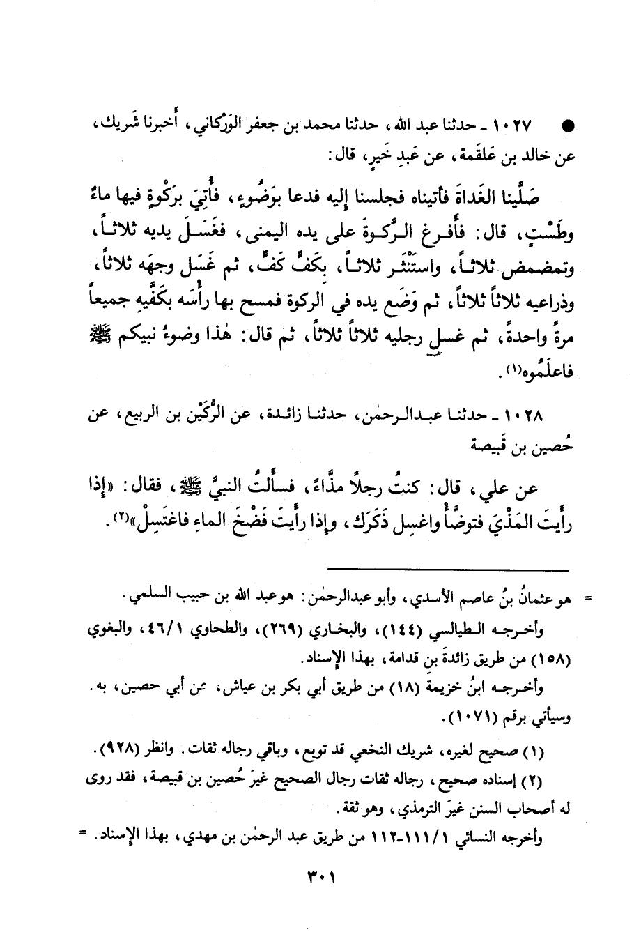 • ١٠٢٧ - حَدَّثَنَا عَبْدُ اللهِ، حَدَّثَنَا مُحَمَّدُ بْنُ جَعْفَرٍ الْوَرْكَانِيُّ، أَخْبَرَنَا شَرِيكٌ، عَنْ خَالِدِ بْنِ عَلْقَمَةَ، عَنْ عَبْدِ خَيْرٍ، قَالَ: صَلَّيْنَا الْغَدَاةَ فَأَتَيْنَاهُ فَجَلَسْنَا إِلَيْهِ فَدَعَا بِوَضُوءٍ، فَأُتِيَ بِرَكْوَةٍ فِيهَا مَاءٌ وَطَسْتٍ، قَالَ: فَأَفْرَغَ الرَّكْوَةَ عَلَى يَدِهِ الْيُمْنَى، " فَغَسَلَ يَدَيْهِ ثَلاثًا، وَتَمَضْمَضَ ثَلاثًا، وَاسْتَنْثَرَ ثَلاثًا، بِكَفٍّ كَفٍّ، ثُمَّ غَسَلَ وَجْهَهُ ثَلاثًا، وَذِرَاعَيْهِ ثَلاثًا ثَلاثًا، ثُمَّ وَضَعَ يَدَهُ فِي الرَّكْوَةِ فَمَسَحَ بِهَا رَأْسَهُ بِكَفَّيْهِ جَمِيعًا مَرَّةً وَاحِدَةً، ثُمَّ غَسَلَ رِجْلَيْهِ ثَلاثًا ثَلاثًا، ثُمَّ قَالَ: هَذَا وُضُوءُ نَبِيِّكُمْ صَلَّى اللهُ عَلَيْهِ وَسَلَّمَ فَاعْلَمُوهُ (١)