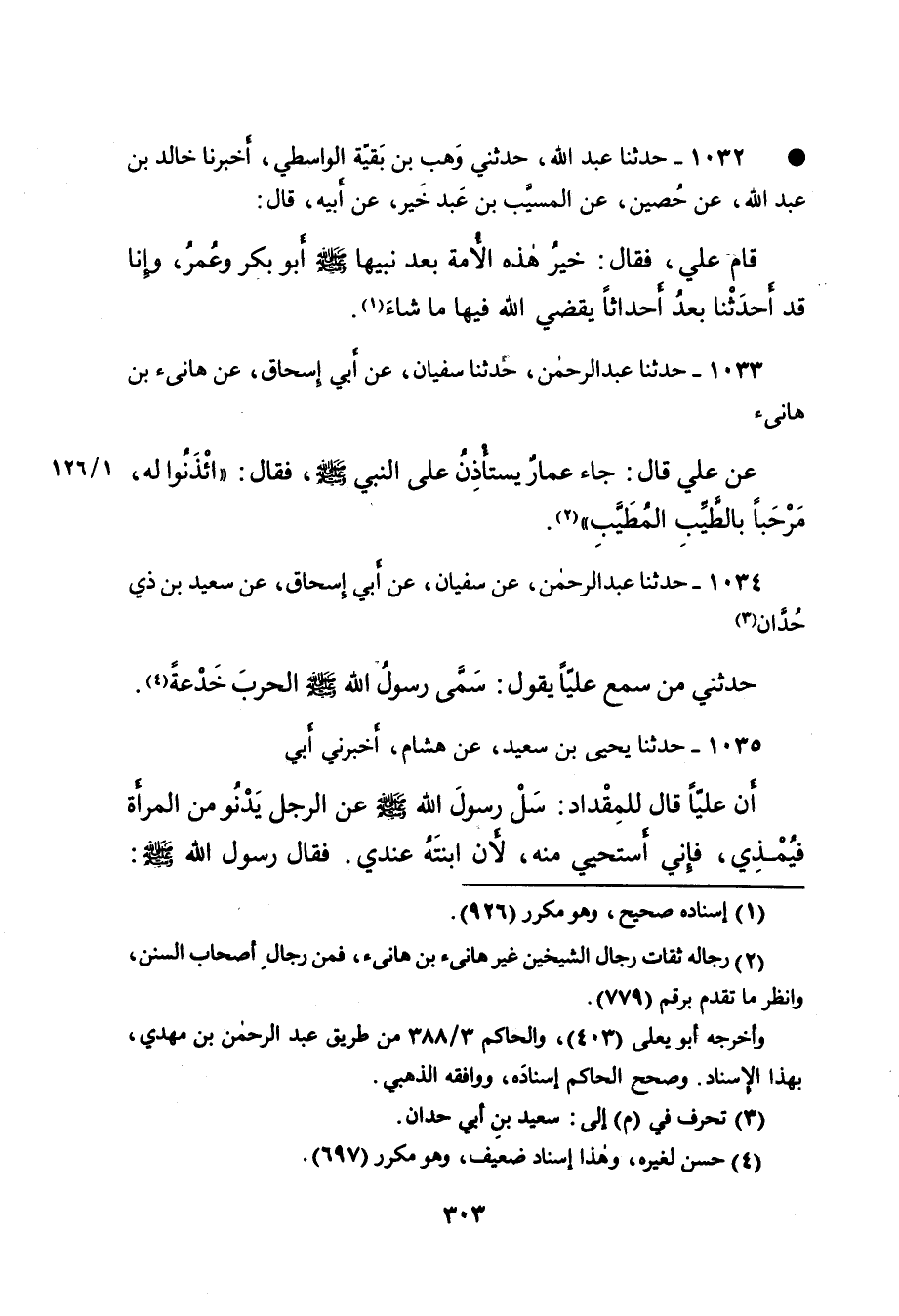 ١٠٣٣ - حَدَّثَنَا عَبْدُ الرَّحْمَنِ، حَدَّثَنَا سُفْيَانُ، عَنْ أَبِي إِسْحَاقَ، عَنْ هَانِئِ بْنِ هَانِئٍ، عَنْ عَلِيٍّ، قَالَ: جَاءَ عَمَّارٌ يَسْتَأْذِنُ عَلَى النَّبِيِّ صَلَّى اللهُ عَلَيْهِ وَسَلَّمَ، فَقَالَ: " ائْذَنُوا لَهُ، مَرْحَبًا بِالطَّيِّبِ الْمُطَيَّبِ " (٢)