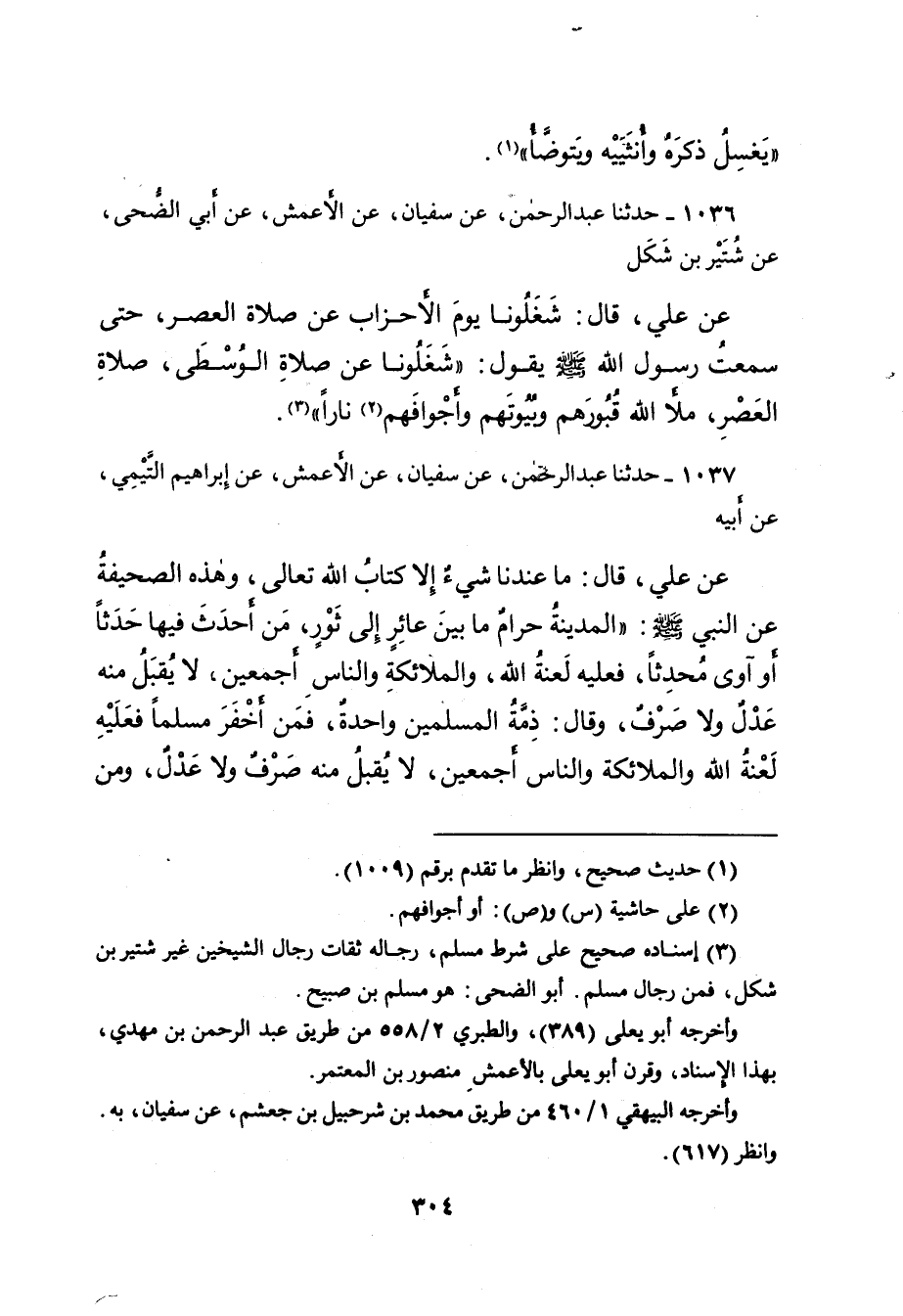 ١٠٣٧ - حَدَّثَنَا عَبْدُ الرَّحْمَنِ، عَنْ سُفْيَانَ، عَنِ الْأَعْمَشِ، عَنْ إِبْرَاهِيمَ التَّيْمِيِّ، عَنْ أَبِيهِ، عَنْ عَلِيٍّ، قَالَ: مَا عِنْدَنَا شَيْءٌ إِلا كِتَابَ اللهِ تَعَالَى، وَهَذِهِ الصَّحِيفَةَ عَنِ النَّبِيِّ صَلَّى اللهُ عَلَيْهِ وَسَلَّمَ: " الْمَدِينَةُ حَرَامٌ مَا بَيْنَ عَائِرٍ، إِلَى ثَوْرٍ، مَنْ أَحْدَثَ فِيهَا حَدَثًا أَوْ آوَى مُحْدِثًا فَعَلَيْهِ لَعْنَةُ اللهِ وَالْمَلائِكَةِ وَالنَّاسِ أَجْمَعِينَ، لَا يُقْبَلُ مِنْهُ عَدْلٌ، وَلا صَرْفٌ، وَقَالَ: ذِمَّةُ الْمُسْلِمِينَ وَاحِدَةٌ، فَمَنْ أَخْفَرَ مُسْلِمًا فَعَلَيْهِ لَعْنَةُ اللهِ وَالْمَلائِكَةِ وَالنَّاسِ أَجْمَعِينَ، لَا يُقْبَلُ مِنْهُ صَرْفٌ، وَلا عَدْلٌ، وَمَنْ