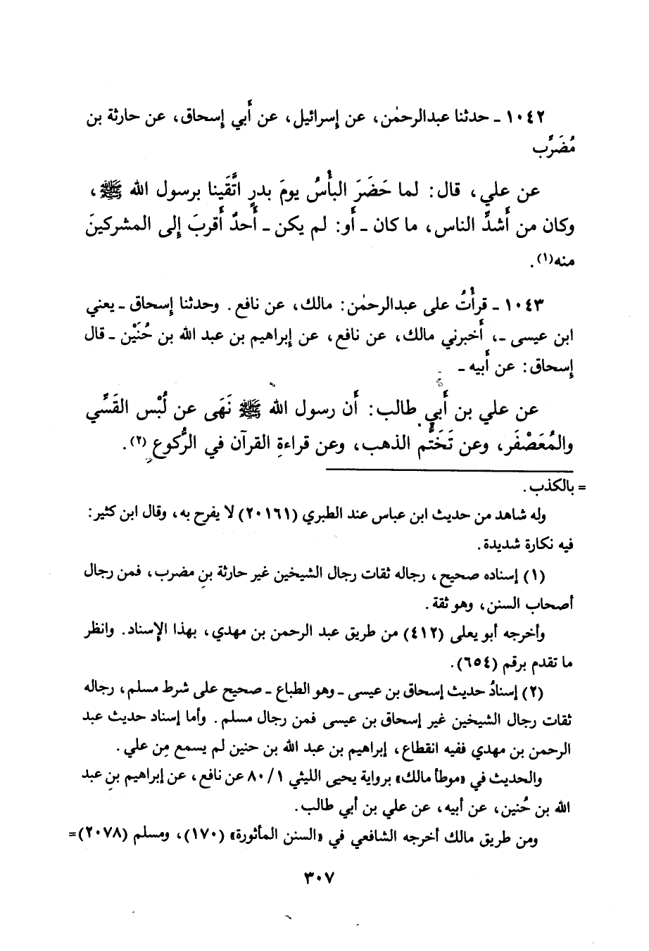 ١٠٤٣ - قَرَأْتُ عَلَى عَبْدِ الرَّحْمَنِ، عَنْ مَالِكٍ، عَنْ نَافِعٍ، وَحَدَّثَنَا إِسْحَاقُ يَعْنِي ابْنَ عِيسَى، أَخْبَرَنِي مَالِكٌ، عَنْ نَافِعٍ، عَنْ إِبْرَاهِيمَ بْنِ عَبْدِ اللهِ بْنِ حُنَيْنٍ، قَالَ إِسْحَاقُ: عَنْ أَبِيهِ، عَنْ عَلِيِّ بْنِ أَبِي طَالِبٍ: " أَنَّ رَسُولَ اللهِ صَلَّى اللهُ عَلَيْهِ وَسَلَّمَ نَهَى عَنْ لُبْسِ الْقَسِّيِّ، وَالْمُعَصْفَرِ، وَعَنْ تَخَتُّمِ الذَّهَبِ، وَعَنْ قِرَاءَةِ الْقُرْآنِ فِي الرُّكُوعِ " (٢)