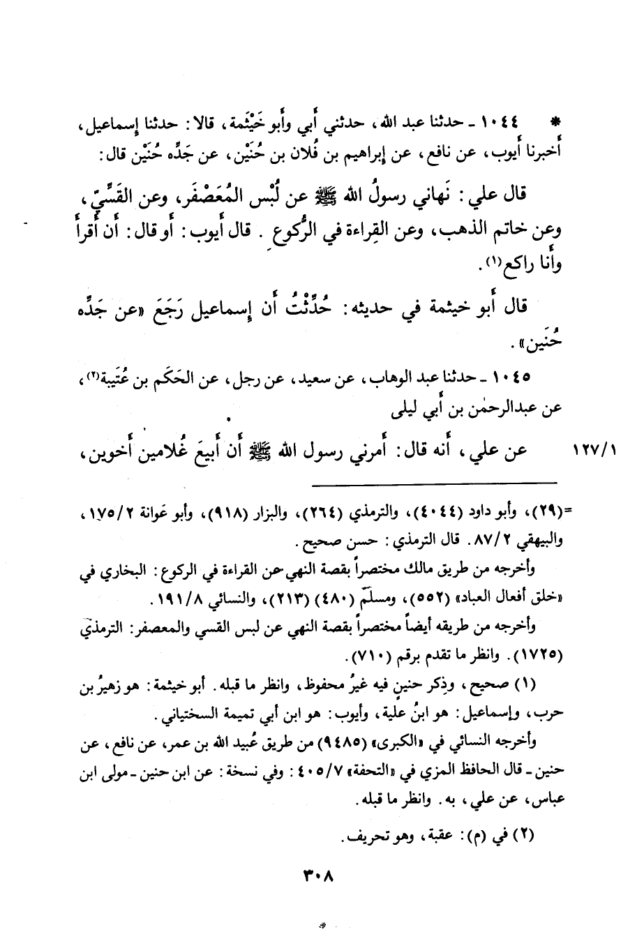 • ١٠٤٤ - حَدَّثَنَا عَبْدُ اللهِ، حَدَّثَنِي أَبِي، وَأَبُو خَيْثَمَةَ، قَالا: حَدَّثَنَا إِسْمَاعِيلُ، أَخْبَرَنَا أَيُّوبُ، عَنْ نَافِعٍ، عَنْ إِبْرَاهِيمَ بْنِ فُلانِ بْنِ حُنَيْنٍ، عَنْ جَدِّهِ حُنَيْنٍ، قَالَ: قَالَ عَلِيٌّ: " نَهَانِي رَسُولُ اللهِ صَلَّى اللهُ عَلَيْهِ وَسَلَّمَ عَنْ لُبْسِ الْمُعَصْفَرِ، وَعَنِ الْقَسِّيِّ، وَعَنْ خَاتَمِ الذَّهَبِ، وَعَنِ الْقِرَاءَةِ فِي الرُّكُوعِ " قَالَ أَيُّوبُ: أَوْ قَالَ: " أَنْ أَقْرَأَ وَأَنَا رَاكِعٌ (١) قَالَ أَبُو خَيْثَمَةَ فِي حَدِيثِهِ: حُدِّثْتُ أَنَّ إِسْمَاعِيلَ رَجَعَ " عَنْ جَدِّهِ حُنَيْنٍ "