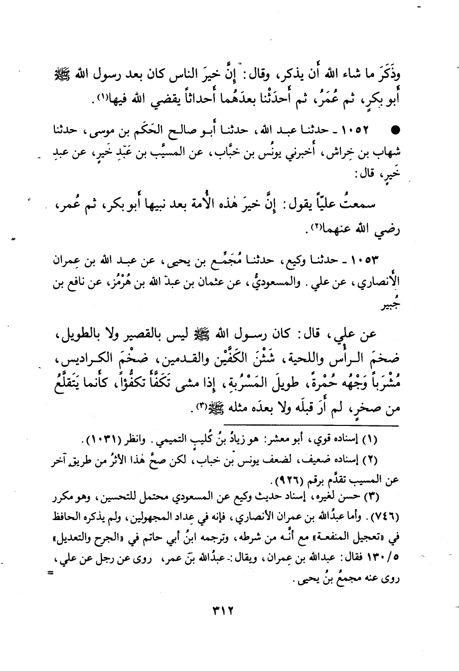 • ١٠٥٢ - حَدَّثَنَا عَبْدُ اللهِ، حَدَّثَنَا أَبُو صَالِحٍ الْحَكَمُ بْنُ مُوسَى، حَدَّثَنَا شِهَابُ بْنُ خِرَاشٍ، أَخْبَرَنِي يُونُسُ بْنُ خَبَّابٍ، عَنِ الْمُسَيَّبِ بْنِ عَبْدِ خَيْرٍ، عَنْ عَبْدِ خَيْرٍ، قَالَ: سَمِعْتُ عَلِيًّا، يَقُولُ: " إِنَّ خَيْرَ هَذِهِ الْأُمَّةِ بَعْدَ نَبِيِّهَا أَبُو بَكْرٍ، ثُمَّ عُمَرُ رَضِيَ اللهُ عَنْهُمَا " (٢)