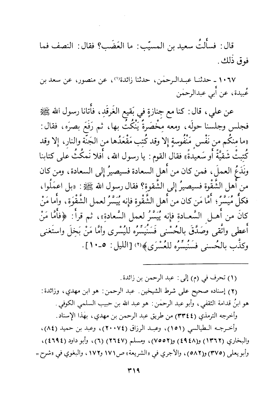 ١٠٦٧ - حَدَّثَنَا عَبْدُ الرَّحْمَنِ، حَدَّثَنَا زَائِدَةُ (١) ، عَنْ مَنْصُورٍ، عَنْ سَعْدِ بْنِ عُبَيْدَةَ، عَنْ أَبِي عَبْدِ الرَّحْمَنِ، عَنْ عَلِيٍّ رَضِيَ اللهُ عَنْهُ، قَالَ: كُنَّا مَعَ جَنَازَةٍ فِي بَقِيعِ الْغَرْقَدِ، فَأَتَانَا رَسُولُ اللهِ صَلَّى اللهُ عَلَيْهِ وَسَلَّمَ فَجَلَسَ. وَجَلَسْنَا حَوْلَهُ وَمَعَهُ مِخْصَرَةٌ يَنْكُتُ بِهَا، ثُمَّ رَفَعَ بَصَرَهُ فَقَالَ: " مَا مِنْكُمْ مِنْ نَفْسٍ مَنْفُوسَةٍ إِلا وَقَدْ كُتِبَ مَقْعَدُهَا مِنَ الجَنَّةِ وَالنَّارِ إِلَّا وقَدْ كُتِبَتْ شَقِيَّةً أَوْ سَعِيدَةً " فَقَالَ الْقَوْمُ: يَا رَسُولَ اللهِ، أَفَلا نَمْكُثُ عَلَى كِتَابِنَا وَنَدَعُ الْعَمَلَ، فَمَنْ كَانَ مِنْ أَهْلِ السَّعَادَةِ فَسَيَصِيرُ إِلَى السَّعَادَةِ، وَمَنْ كَانَ مِنْ أَهْلِ الشِّقْوَةِ فَسَيَصِيرُ إِلَى الشِّقْوَةِ؟ فَقَالَ رَسُولُ اللهِ صَلَّى اللهُ عَلَيْهِ وَسَلَّمَ: " بَلِ اعْمَلُوا فَكُلٌّ مُيَسَّرٌ، أَمَّا مَنْ كَانَ مِنْ أَهْلِ الشِّقْوَةِ فَإِنَّهُ يُيَسَّرُ لِعَمَلِ الشِّقْوَةِ، وَأَمَّا مَنْ كَانَ مِنْ أَهْلِ السَّعَادَةِ فَإِنَّهُ يُيَسَّرُ لِعَمَلِ السَّعَادَةِ " ثُمَّ قَرَأَ: {فَأَمَّا مَنْ أَعْطَى وَاتَّقَى وَصَدَّقَ باِلْحُسْنَى فَسَنُيَسِّرُهُ لِلْيُسْرَى وَأَمَّا مَنْ بَخِلَ وَاسْتَغْنَى وَكَذَّبَ بِالْحُسْنَى فَسَنُيَسِّرُهُ لِلعُسْرَى} (٢) [الليل: ٦] ،