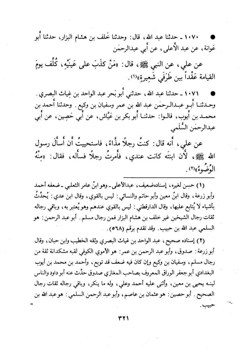 • ١٠٧٠ - حَدَّثَنَا عَبْدُ اللهِ، قَالَ: وَحَدَّثَنَا خَلَفُ بْنُ هِشَامٍ الْبَزَّارُ، حَدَّثَنَا أَبُو عَوَانَةَ، عَنْ عَبْدِ الْأَعْلَى، عَنْ أَبِي عَبْدِ الرَّحْمَنِ، عَنْ عَلِيٍّ، عَنِ النَّبِيِّ صَلَّى اللهُ عَلَيْهِ وَسَلَّمَ قَالَ: " مَنْ كَذَبَ عَلَى عَيْنَيْهِ كُلِّفَ يَوْمَ الْقِيَامَةِ عَقْدًا بَيْنَ طَرَفَيْ شَعِيرَةٍ (١) "