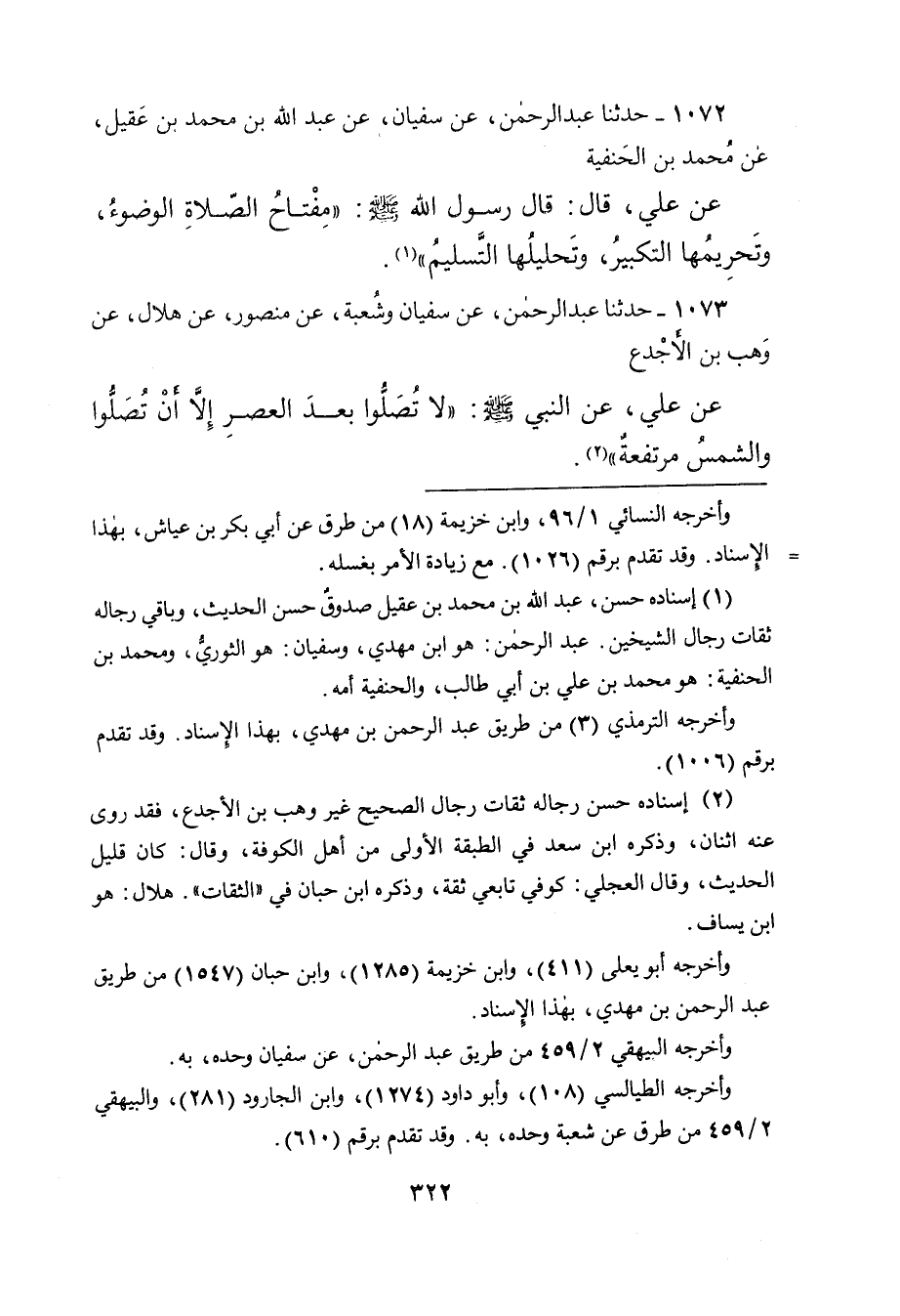١٠٧٢ - حَدَّثَنَا عَبْدُ الرَّحْمَنِ، عَنْ سُفْيَانَ، عَنْ عَبْدِ اللهِ بْنِ مُحَمَّدِ بْنِ عَقِيلٍ، عَنْ مُحَمَّدِ ابْنِ الْحَنَفِيَّةِ، عَنْ عَلِيٍّ، قَالَ: قَالَ رَسُولُ اللهِ صَلَّى اللهُ عَلَيْهِ وَسَلَّمَ: " مِفْتَاحُ الصَّلاةِ الْوُضُوءُ، وَتَحْرِيمُهَا التَّكْبِيرُ، وَتَحْلِيلُهَا التَّسْلِيمُ " (١)
