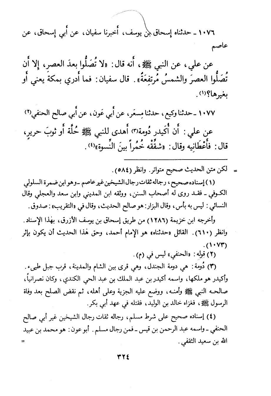 ١٠٧٧ - حَدَّثَنَاهُ وَكِيعٌ، حَدَّثَنَا مِسْعَرٌ، عَنْ أَبِي عَوْنٍ، عَنْ أَبِي صَالِحٍ الْحَنَفِيِّ (٢) ، عَنْ عَلِيٍّ: أَنَّ أُكَيْدِرَ دُومَةَ (٣) أَهْدَى لِلنَّبِيِّ صَلَّى اللهُ عَلَيْهِ وَسَلَّمَ حُلَّةً - أَوْ ثَوْبَ - حَرِيرٍ، قَالَ: فَأَعْطَانِيهِ وَقَالَ: " شَقِّقْهُ خُمُرًا بَيْنَ النِّسْوَةِ " (٤)