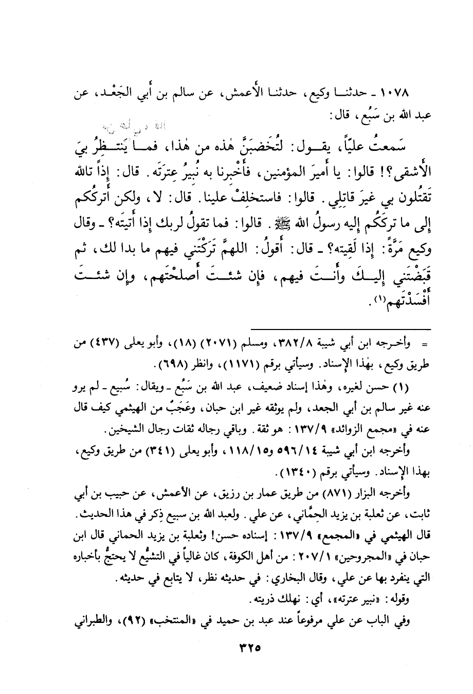 ١٠٧٨ - حَدَّثَنَا وَكِيعٌ، حَدَّثَنَا الْأَعْمَشُ، عَنْ سَالِمِ بْنِ أَبِي الْجَعْدِ، عَنْ عَبْدِ اللهِ بْنِ سَبُعٍ، قَالَ: سَمِعْتُ عَلِيًّا، يَقُولُ: " لَتُخْضَبَنَّ هَذِهِ مِنْ هَذَا فَمَا يَنْتَظِرُ بِي الْأَشْقَى " قَالُوا: يَا أَمِيرَ الْمُؤْمِنِينَ: فَأَخْبِرْنَا بِهِ نُبِيرُ عِتْرَتَهُ، قَالَ: " إِذًا تَالَلَّهِ تَقْتُلُونَ بِي غَيْرَ قَاتِلِي ". قَالُوا: فَاسْتَخْلِفْ عَلَيْنَا. قَالَ: " لَا، وَلَكِنِ أَتْرُكُكُمْ إِلَى مَا تَرَكَكُمِ إلَيْهِ رَسُولُ اللهِ صَلَّى اللهُ عَلَيْهِ وَسَلَّمَ " قَالُوا: فَمَا تَقُولُ لِرَبِّكَ إِذَا أَتَيْتَهُ؟ - وَقَالَ وَكِيعٌ مَرَّةً: إِذَا لَقِيتَهُ؟ - قَالَ: " أَقُولُ: اللهُمَّ تَرَكْتَنِي فِيهِمْ مَا بَدَا لَكَ، ثُمَّ قَبَضْتَنِي إِلَيْكَ وَأَنْتَ فِيهِمْ، فَإِنْ شِئْتَ أَصْلَحْتَهُمْ وَإِنْ شِئْتَ أَفْسَدْتَهُمْ " (١)