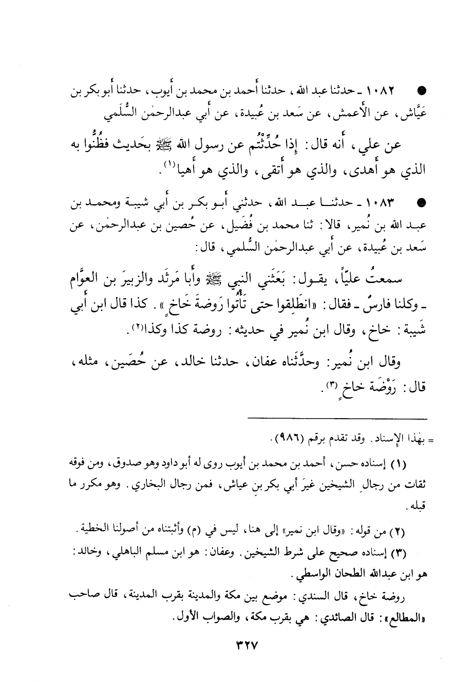 • ١٠٨٣ - حَدَّثَنَا عَبْدُ اللهِ، حَدَّثَنِي أَبُو بَكْرِ بْنُ أَبِي شَيْبَةَ، وَمُحَمَّدُ بْنُ عَبْدِ اللهِ بْنِ نُمَيْرٍ، قَالَا: حَدَّثَنَا مُحَمَّدُ بْنُ فُضَيْلٍ، عَنْ حُصَيْنِ بْنِ عَبْدِ الرَّحْمَنِ، عَنْ سَعْدِ بْنِ عُبَيْدَةَ، عَنْ أَبِي عَبْدِ الرَّحْمَنِ السُّلَمِيِّ، قَالَ: سَمِعْتُ عَلِيًّا، يَقُولُ: بَعَثَنِي رَسُولُ اللهِ صَلَّى اللهُ عَلَيْهِ وَسَلَّمَ وَأَبَا مَرْثَدٍ، وَالزُّبَيْرَ بْنَ الْعَوَّامِ، وَكُلُّنَا فَارِسٌ، فَقَالَ: " انْطَلِقُوا حَتَّى تَأْتُوا رَوْضَةَ خَاخٍ " كَذَا قَالَ ابْنُ أَبِي شَيْبَةَ: " خَاخٍ "، وقَالَ ابْنُ نُمَيْرٍ فِي حَدِيثِهِ: " رَوْضَةَ كَذَا وَكَذَا (٢) "، وَقَالَ ابْنُ نُمَيْرٍ: حَدَّثَنَاهُ عَفَّانُ، حَدَّثَنَا خَالِدٌ، عَنْ حُصَيْنٍ: مِثْلَهُ، قَالَ: " رَوْضَةَ خَاخٍ " (٣)