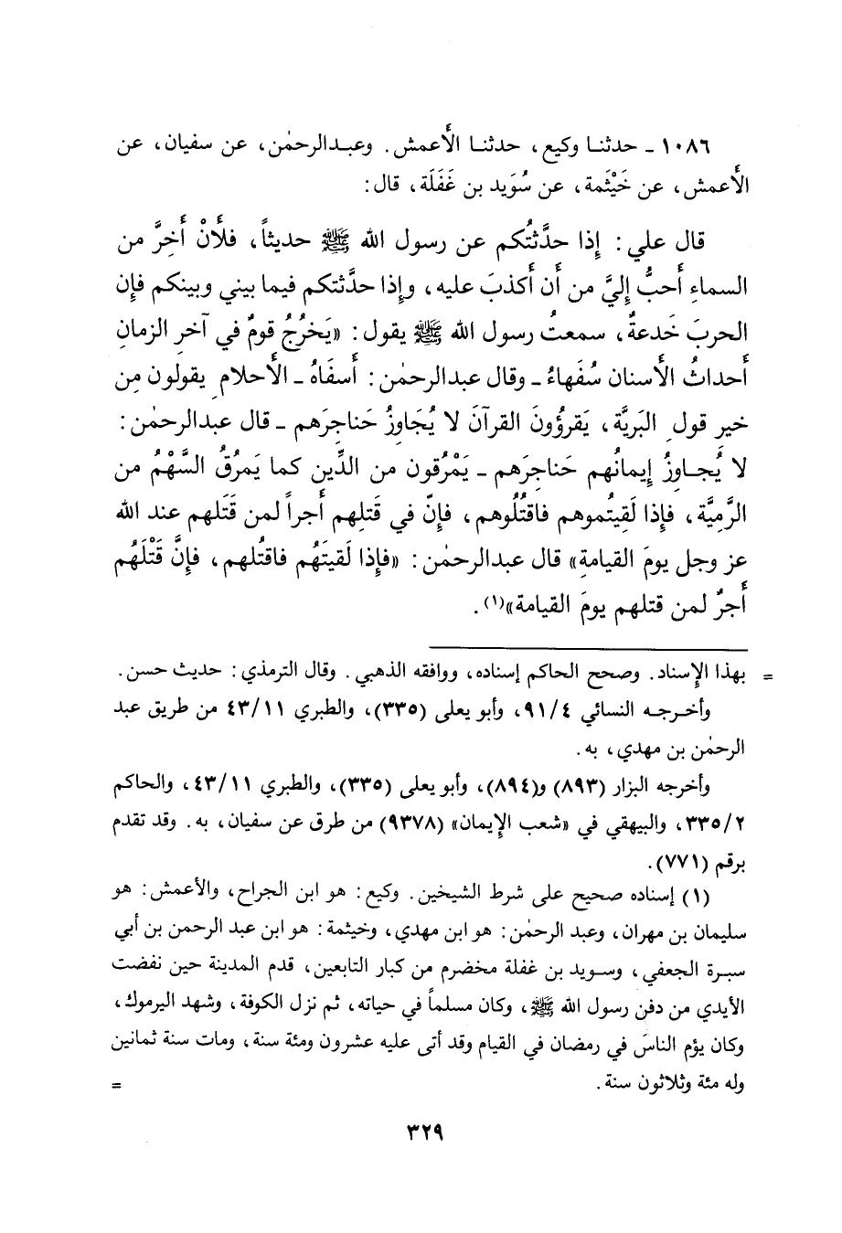 ١٠٨٦ - حَدَّثَنَا وَكِيعٌ، حَدَّثَنَا الْأَعْمَشُ، وَعَبْدُ الرَّحْمَنِ، عَنْ سُفْيَانَ، عَنِ الْأَعْمَشِ، عَنْ خَيْثَمَةَ، عَنْ سُوَيْدِ بْنِ غَفَلَةَ، قَالَ: قَالَ عَلِيٌّ: إِذَا حَدَّثْتُكُمْ عَنْ رَسُولِ اللهِ صَلَّى اللهُ عَلَيْهِ وَسَلَّمَ حَدِيثًا، فَلَأَنْ أَخِرَّ مِنَ السَّمَاءِ أَحَبُّ إِلَيَّ مِنْ أَنْ أَكْذِبَ عَلَيْهِ، وَإِذَا حَدَّثْتُكُمْ فِيمَا بَيْنِي وَبَيْنَكُمْ فَإِنَّ الْحَرْبَ خَدْعَةٌ. سَمِعْتُ رَسُولَ اللهِ صَلَّى اللهُ عَلَيْهِ وَسَلَّمَ يَقُولُ: " يَخْرُجُ قَوْمٌ فِي آخِرِ الزَّمَانِ أَحْدَاثُ الْأَسْنَانِ سُفَهَاءُ - وَقَالَ عَبْدُ الرَّحْمَنِ: أَسْفَاهُ - الْأَحْلامِ يَقُولُونَ مِنْ خَيْرِ قَوْلِ الْبَرِيَّةِ يَقْرَءُونَ الْقُرْآنَ، لَا يُجَاوِزُ حَنَاجِرَهُمْ - قَالَ عَبْدُ الرَّحْمَنِ: لَا يُجَاوِزُ إِيمَانُهُمْ حَنَاجِرَهُمْ - يَمْرُقُونَ مِنَ الدِّينِ، كَمَا يَمْرُقُ السَّهْمُ مِنَ الرَّمِيَّةِ، فَإِذَا لَقِيتُمُوهُمْ فَاقْتُلُوهُمْ، فَإِنَّ فِي قَتْلِهِمْ أَجْرًا لِمَنْ قَتَلَهُمْ عِنْدَ اللهِ عَزَّ وَجَلَّ يَوْمَ الْقِيَامَةِ " قَالَ عَبْدُ الرَّحْمَنِ: " فَإِذَا لَقِيتَهُمْ فَاقْتُلْهُمْ فَإِنَّ قَتْلَهُمْ أَجْرٌ لِمَنْ قَتَلَهُمْ يَوْمَ الْقِيَامَةِ " (١)
