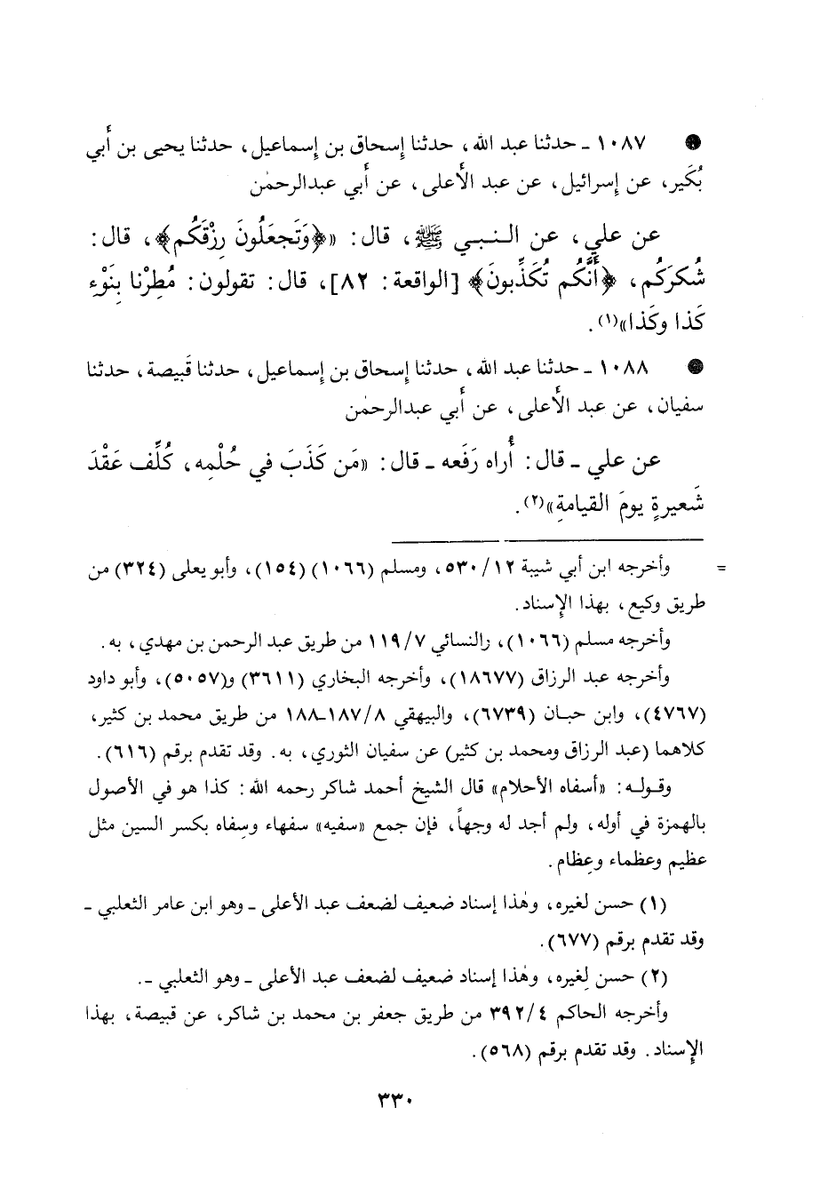 • ١٠٨٧ - حَدَّثَنَا عَبْدُ اللهِ، حَدَّثَنَا إِسْحَاقُ بْنُ إِسْمَاعِيلَ، حَدَّثَنَا يَحْيَى بْنُ أَبِي بُكَيْرٍ، عَنْ إِسْرَائِيلَ، عَنْ عَبْدِ الْأَعْلَى، عَنْ أَبِي عَبْدِ الرَّحْمَنِ، عَنْ عَلِيٍّ، عَنِ النَّبِيِّ صَلَّى اللهُ عَلَيْهِ وَسَلَّمَ قَالَ: {وَتَجْعَلُونَ رِزْقَكُمْ} [الواقعة: ٨٢] قَالَ: " شُكْرَكُمْ "، {أَنَّكُمْ تُكَذِّبُونَ} [الواقعة: ٨٢] قَالَ: " تَقُولُونَ مُطِرْنَا بِنَوْءِ كَذَا وَكَذَا (١) "