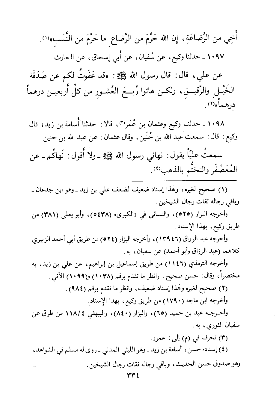 ١٠٩٧ - حَدَّثَنَا وَكِيعٌ، عَنْ سُفْيَانَ، عَنْ أَبِي إِسْحَاقَ، عَنِ الْحَارِثِ، عَنْ عَلِيٍّ، قَالَ: قَالَ رَسُولُ اللهِ صَلَّى اللهُ عَلَيْهِ وَسَلَّمَ: " قَدْ عَفَوْتُ لَكُمْ عَنْ صَدَقَةِ الْخَيْلِ وَالرَّقِيقِ، وَلَكِنْ هَاتُوا رُبُعَ الْعُشُورِ، مِنْ كُلِّ أَرْبَعِينَ دِرْهَمًا دِرْهَمًا " (٢)