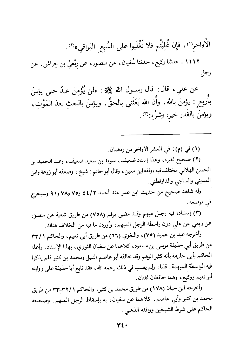 ١١١٢ - حَدَّثَنَا وَكِيعٌ، حَدَّثَنَا سُفْيَانُ، عَنْ مَنْصُورٍ، عَنْ رِبْعِيِّ بْنِ حِرَاشٍ، عَنْ رَجُلٍ، عَنْ عَلِيٍّ، قَالَ: قَالَ رَسُولُ اللهِ صَلَّى اللهُ عَلَيْهِ وَسَلَّمَ: " لَنْ يُؤْمِنَ عَبْدٌ، حَتَّى يُؤْمِنَ بِأَرْبَعٍ: يُؤْمِنُ بِاللهِ، وَأَنَّ اللهَ بَعَثَنِي بِالْحَقِّ، وَيُؤْمِنُ بِالْبَعْثِ بَعْدَ الْمَوْتِ، وَيُؤْمِنُ بِالْقَدَرِ خَيْرِهِ وَشَرِّهِ " (٣)