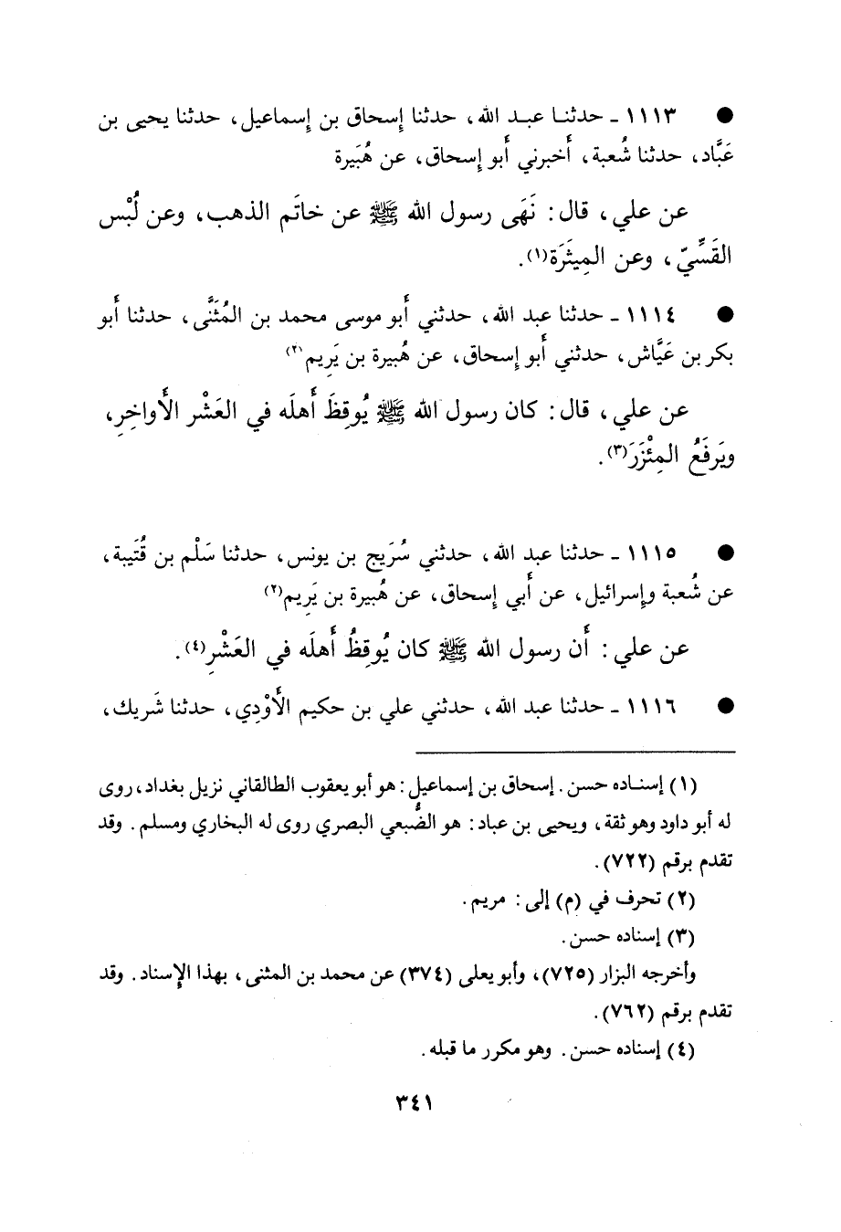 • ١١١٣ - حَدَّثَنَا عَبْدُ اللهِ، حَدَّثَنَا إِسْحَاقُ بْنُ إِسْمَاعِيلَ، حَدَّثَنَا يَحْيَى بْنُ عَبَّادٍ، حَدَّثَنَا شُعْبَةُ، أَخْبَرَنِي أَبُو إِسْحَاقَ، عَنْ هُبَيْرَةَ، عَنْ عَلِيٍّ، قَالَ: " نَهَى رَسُولُ اللهِ صَلَّى اللهُ عَلَيْهِ وَسَلَّمَ عَنْ خَاتَمِ الذَّهَبِ، وَعَنْ لُبْسِ الْقَسِّيِّ، وَعَنِ الْمِيثَرَةِ (١) "