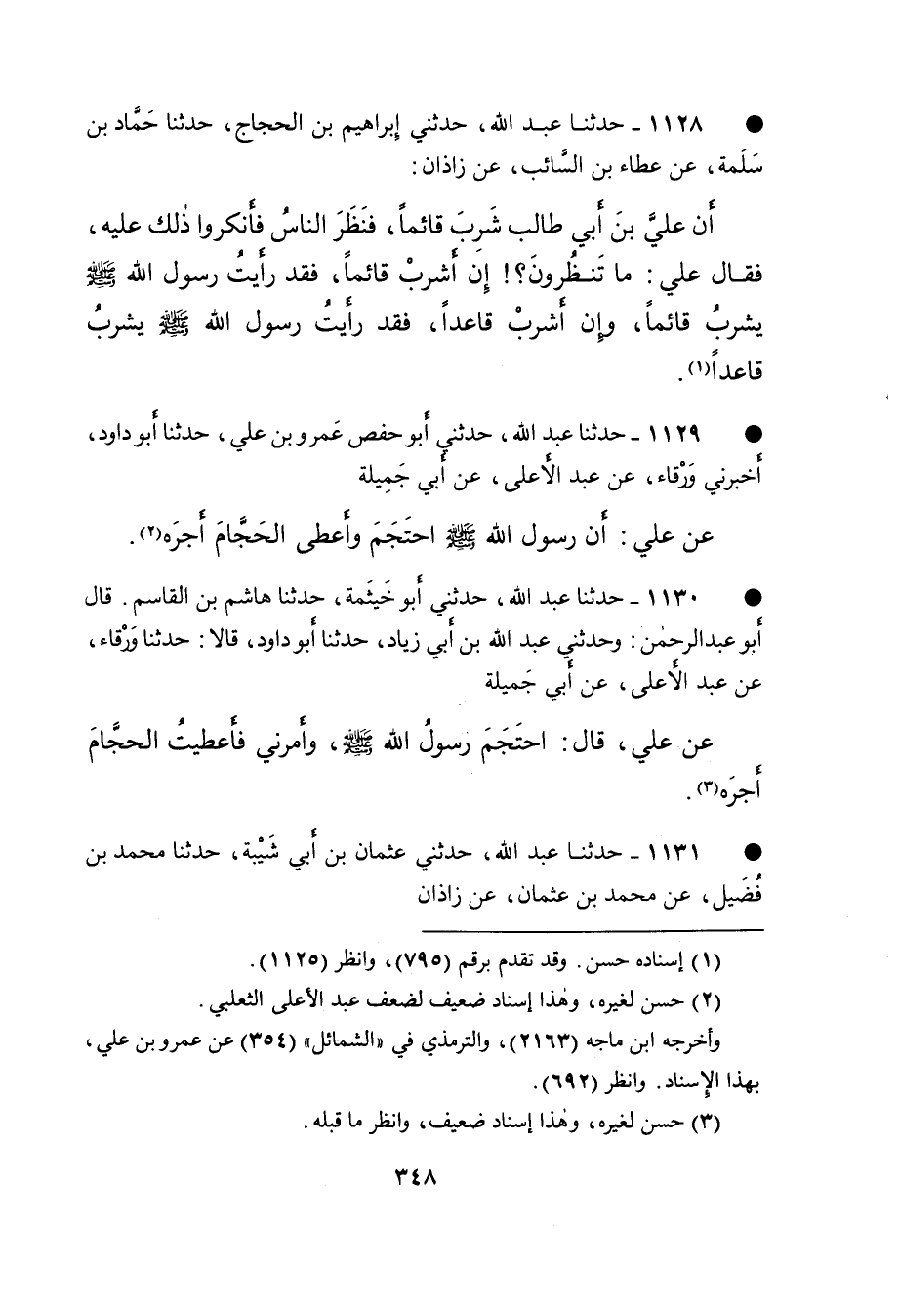 • ١١٢٨ - حَدَّثَنَا عَبْدُ اللهِ، حَدَّثَنِي إِبْرَاهِيمُ بْنُ الْحَجَّاجِ، حَدَّثَنَا حَمَّادُ بْنُ سَلَمَةَ، عَنْ عَطَاءِ بْنِ السَّائِبِ، عَنْ زَاذَانَ: أَنَّ عَلِيَّ بْنَ أَبِي طَالِبٍ، شَرِبَ قَائِمًا، فَنَظَرَ النَّاسُ، فَأَنْكَرُوا ذَلِكَ عَلَيْهِ، فَقَالَ عَلِيٌّ: " مَا تَنْظُرُونَ إِنْ أَشْرَبْ قَائِمًا، فَقَدْ رَأَيْتُ رَسُولَ اللهِ صَلَّى اللهُ عَلَيْهِ وَسَلَّمَ يَشْرَبُ قَائِمًا، وَإِنْ أشْرَبْ قَاعِدًا فَقَدْ رَأَيْتُ رَسُولَ اللهِ صَلَّى اللهُ عَلَيْهِ وَسَلَّمَ يَشْرَبُ قَاعِدًا " (١)