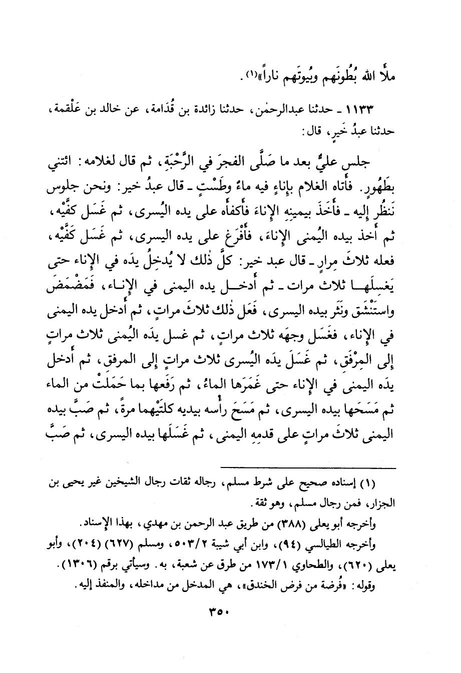 ١١٣٣ - حَدَّثَنَا عَبْدُ الرَّحْمَنِ، حَدَّثَنَا زَائِدَةُ بْنُ قُدَامَةَ، عَنْ خَالِدِ بْنِ عَلْقَمَةَ، حَدَّثَنَا عَبْدُ خَيْرٍ قَالَ: جَلَسَ عَلِيٌّ بَعْدَمَا صَلَّى الْفَجْرَ فِي الرَّحَبَةِ، ثُمَّ قَالَ لِغُلامِهِ: ائْتِنِي بِطَهُورٍ، فَأَتَاهُ الْغُلامُ بِإِنَاءٍ فِيهِ مَاءٌ وَطَسْتٍ - قَالَ عَبْدُ خَيْرٍ: وَنَحْنُ جُلُوسٌ نَنْظُرُ إِلَيْهِ - " فَأَخَذَ بِيَمِينِهِ الْإِنَاءَ فَأَكْفَأَهُ عَلَى يَدِهِ الْيُسْرَى، ثُمَّ غَسَلَ كَفَّيْهِ، ثُمَّ أَخَذَ بِيَدِهِ الْيُمْنَى الْإِنَاءَ، فَأَفْرَغَ عَلَى يَدِهِ الْيُسْرَى ثُمَّ غَسَلَ كَفَّيْهِ، فَعَلَهُ ثَلاثَ مِرَارٍ - قَالَ عَبْدُ خَيْرٍ: كُلُّ ذَلِكَ لَا يُدْخِلُ يَدَهُ فِي الْإِنَاءِ حَتَّى يَغْسِلَهَا ثَلاثَ مَرَّاتٍ - ثُمَّ أَدْخَلَ يَدَهُ الْيُمْنَى فِي الْإِنَاءِ فَمَضْمَضَ، وَاسْتَنْشَقَ وَنَثَرَ بِيَدِهِ الْيُسْرَى فَعَلَ ذَلِكَ ثَلاثَ مَرَّاتٍ، ثُمَّ أَدْخَلَ يَدَهُ الْيُمْنَى فِي الْإِنَاءِ، فَغَسَلَ وَجْهَهُ ثَلاثَ مَرَّاتٍ، ثُمَّ غَسَلَ يَدَهُ الْيُمْنَى ثَلاثَ مَرَّاتٍ إِلَى الْمِرْفَقِ، ثُمَّ غَسَلَ يَدَهُ الْيُسْرَى ثَلاثَ مَرَّاتٍ إِلَى الْمِرْفَقِ، ثُمَّ أَدْخَلَ يَدَهُ الْيُمْنَى فِي الْإِنَاءِ حَتَّى غَمَرَهَا الْمَاءُ، ثُمَّ رَفَعَهَا بِمَا حَمَلَتْ مِنَ المَاءِ، ثُمَّ مَسَحَهَا بِيَدِهِ الْيُسْرَى، ثُمَّ مَسَحَ رَأْسَهُ بِيَدَيْهِ كِلْتَيْهِمَا مَرَّةً، ثُمَّ صَبَّ بِيَدِهِ الْيُمْنَى ثَلاثَ مَرَّاتٍ عَلَى قَدَمِهِ الْيُمْنَى، ثُمَّ غَسَلَهَا بِيَدِهِ الْيُسْرَى، ثُمَّ صَبَّ