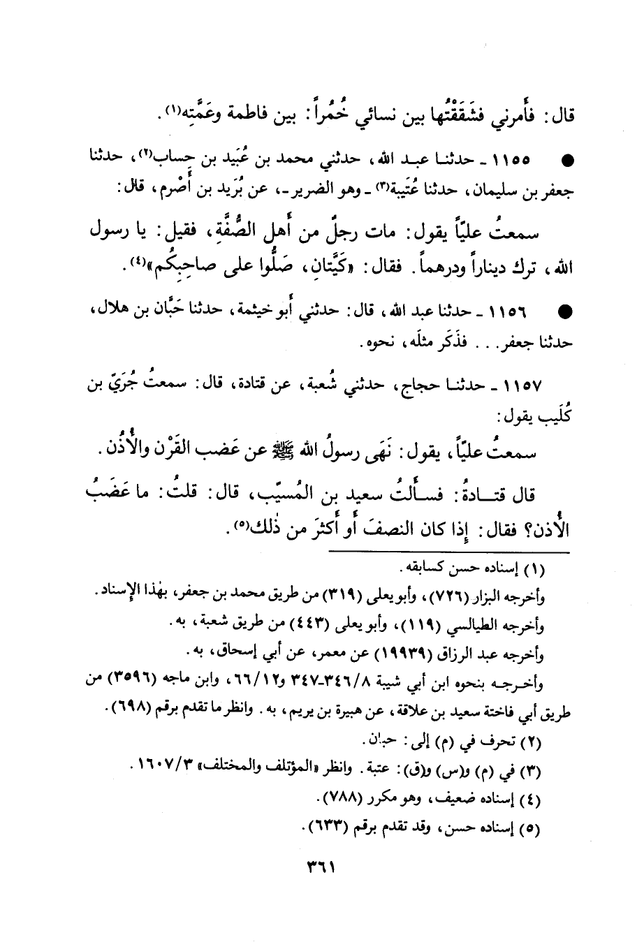 ١١٥٧ - حَدَّثَنَا حَجَّاجٌ، حَدَّثَنِي شُعْبَةُ، عَنْ قَتَادَةَ، قَالَ: سَمِعْتُ جُرَيَّ بْنَ كُلَيْبٍ، يَقُولُ: سَمِعْتُ عَلِيًّا، يَقُولُ: " نَهَى رَسُولُ اللهِ صَلَّى اللهُ عَلَيْهِ وَسَلَّمَ عَنْ عَضَبِ الْقَرْنِ وَالْأُذُنِ " قَالَ قَتَادَةُ: فَسَأَلْتُ سَعِيدَ بْنَ الْمُسَيِّبِ، قَالَ: قُلْتُ: مَا عَضَبُ الْأُذُنِ؟ فَقَالَ: " إِذَا كَانَ النِّصْفَ أَوِ اكْثَرَ مِنْ ذَلِكَ " (٥)