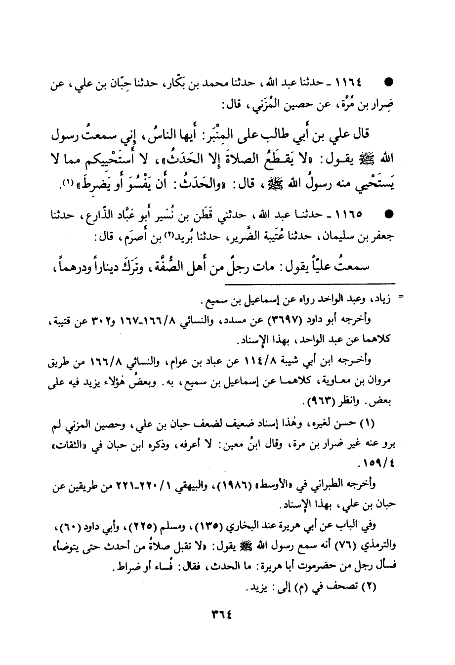 • ١١٦٤ - حَدَّثَنَا عَبْدُ اللهِ، حَدَّثَنَا مُحَمَّدُ بْنُ بَكَّارٍ، حَدَّثَنَا حِبَّانُ بْنُ عَلِيٍّ، عَنْ ضِرَارِ بْنِ مُرَّةَ، عَنْ حُصَيْنٍ الْمُزَنِيِّ، قَالَ: قَالَ عَلِيُّ بْنُ أَبِي طَالِبٍ عَلَى الْمِنْبَرِ: أَيُّهَا النَّاسُ إِنِّي سَمِعْتُ رَسُولَ اللهِ صَلَّى اللهُ عَلَيْهِ وَسَلَّمَ يَقُولُ: " لَا يَقْطَعُ الصَّلاةَ إِلا الْحَدَثُ "، لَا أَسْتَحْيِيكُمْ مِمَّا لَا يَسْتَحْيِي مِنْهُ رَسُولُ اللهِ صَلَّى اللهُ عَلَيْهِ وَسَلَّمَ قَالَ: وَالْحَدَثُ: أَنْ يَفْسُوَ أَوْ يَضْرِطَ (١)