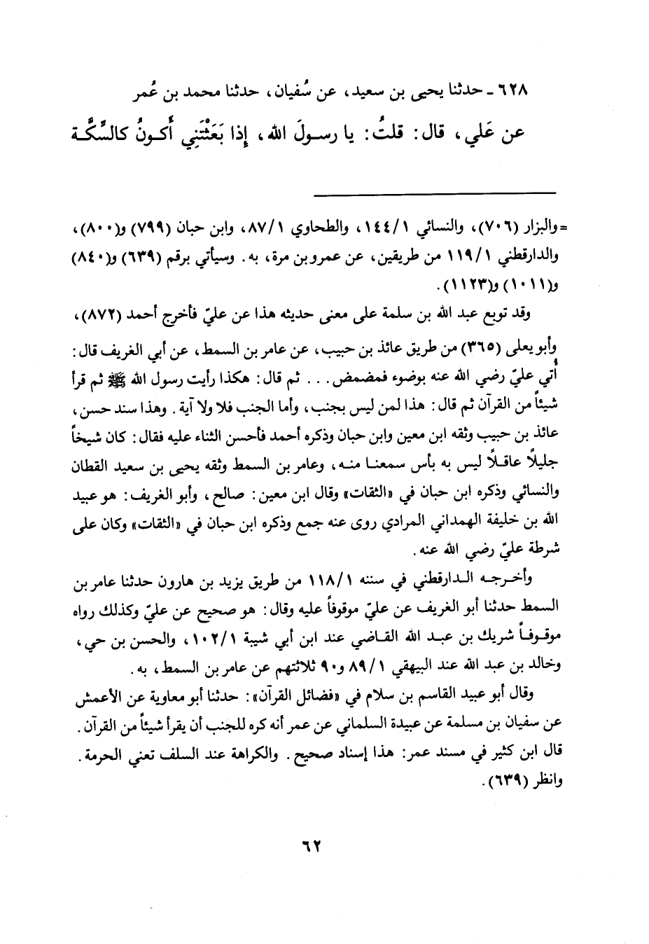 ٦٢٨ - حَدَّثَنَا يَحْيَى بْنُ سَعِيدٍ، عَنْ سُفْيَانَ، حَدَّثَنَا مُحَمَّدُ بْنُ عُمَرَ بْنِ عَلِيِّ، عَنْ عَلِيٍّ، قَالَ: قُلْتُ: يَا رَسُولَ اللهِ، إِذَا بَعَثْتَنِي أَكُونُ كَالسِّكَّةِ