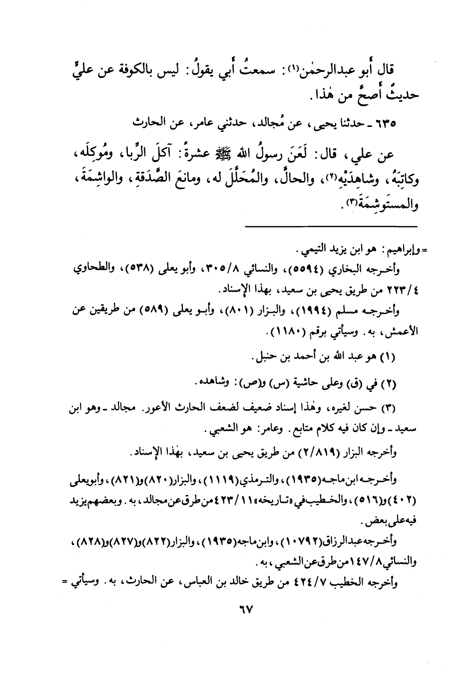 ٦٣٥ - حَدَّثَنَا يَحْيَى، عَنْ مُجَالِدٍ، حَدَّثَنِي عَامِرٌ، عَنْ الْحَارِثِ، عَنْ عَلِيٍّ، قَالَ: " لَعَنَ رَسُولُ اللهِ صَلَّى اللهُ عَلَيْهِ وَسَلَّمَ عَشْرَةً: آكِلَ الرِّبَا، وَمُوكِلَهُ، وَكَاتِبَهُ، وَشَاهِدَيْهِ (٢) ، وَالْحَالَّ، وَالْمُحَلَّلَ لَهُ، وَمَانِعَ الصَّدَقَةِ، وَالْوَاشِمَةَ وَالْمُسْتَوْشِمَةَ " (٣)