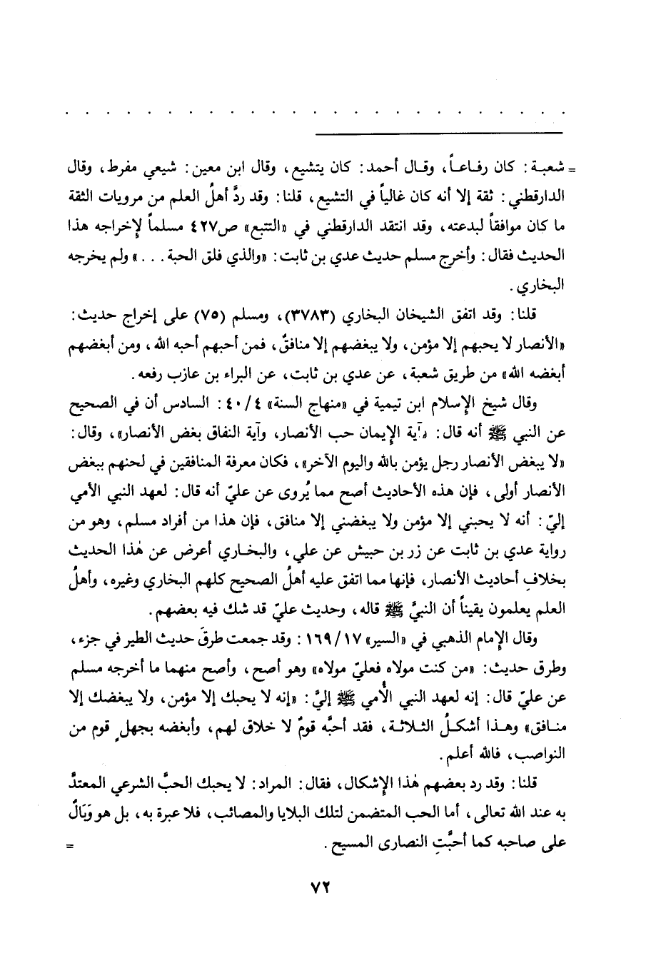 وقال شيخ الإسلام ابن تيمية في "منهاج السنة" ٤/٤٠: السادس أن في الصحيح عن النبي صَلَّى اللهُ عَلَيْهِ وَسَلَّمَ أنه قال: "آية الإيمان حب الأنصار، وآية النفاق بغض الأنصار"، وقال: "لا يبغض الأنصار رجل يؤمن بالله واليوم الآخر"، فكان معرفة المنافقين في لحنهم ببغض الأنصار أولى، فإن هذه الأحاديث أصح مما يُروى عن عليّ أنه قال: لعهد النبي الأمي إلي: أنه لا يحبني إلا مؤمن ولا يبغضني إلا منافق، فإن هذا من أفراد مسلم، وهو من رواية عدي بن ثابت عن زر بن حبيس عن علي، والبخاري أعرض عن هذا الحديث بخلافِ أحاديث الأنصار، فإنها مما اتفق عليه أهل الصحيح كلهم البخاري وغيره، وأهلُ العلم يعلمون يقيناً أن النبى صَلَّى اللهُ عَلَيْهِ وَسَلَّمَ قاله، وحديث علي قد شك فيه بعضهم.