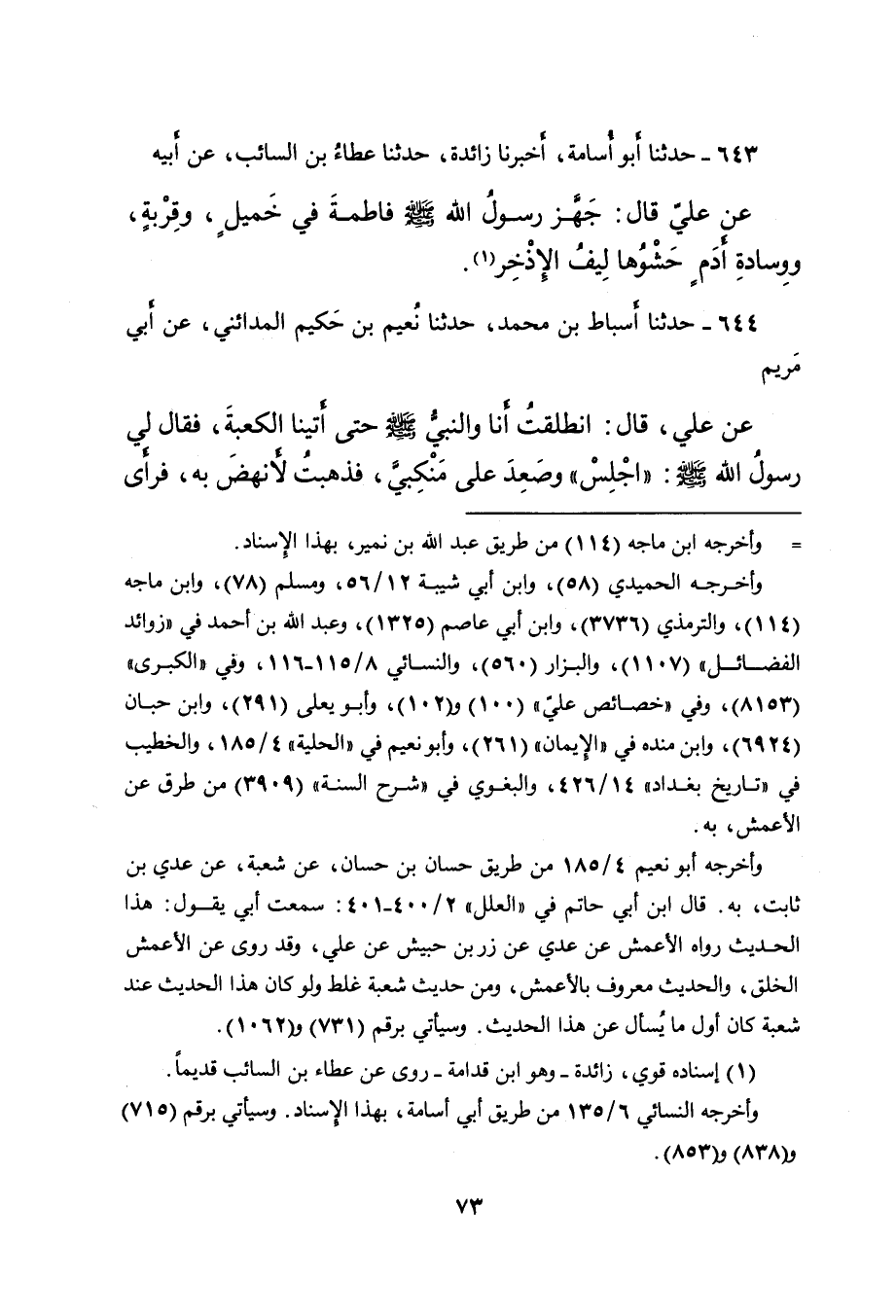 ٦٤٣ - حَدَّثَنَا أَبُو أُسَامَةَ، أَخْبَرَنَا زَائِدَةُ، حَدَّثَنَا عَطَاءُ بْنُ السَّائِبِ، عَنْ أَبِيهِ، عَنْ عَلِيٍّ، قَالَ: " جَهَّزَ رَسُولُ اللهِ صَلَّى اللهُ عَلَيْهِ وَسَلَّمَ فَاطِمَةَ فِي خَمِيلٍ، وَقِرْبَةٍ، وَوِسَادَةِ أَدَمٍ حَشْوُهَا لِيفُ الْإِذْخِرِ " (١)
