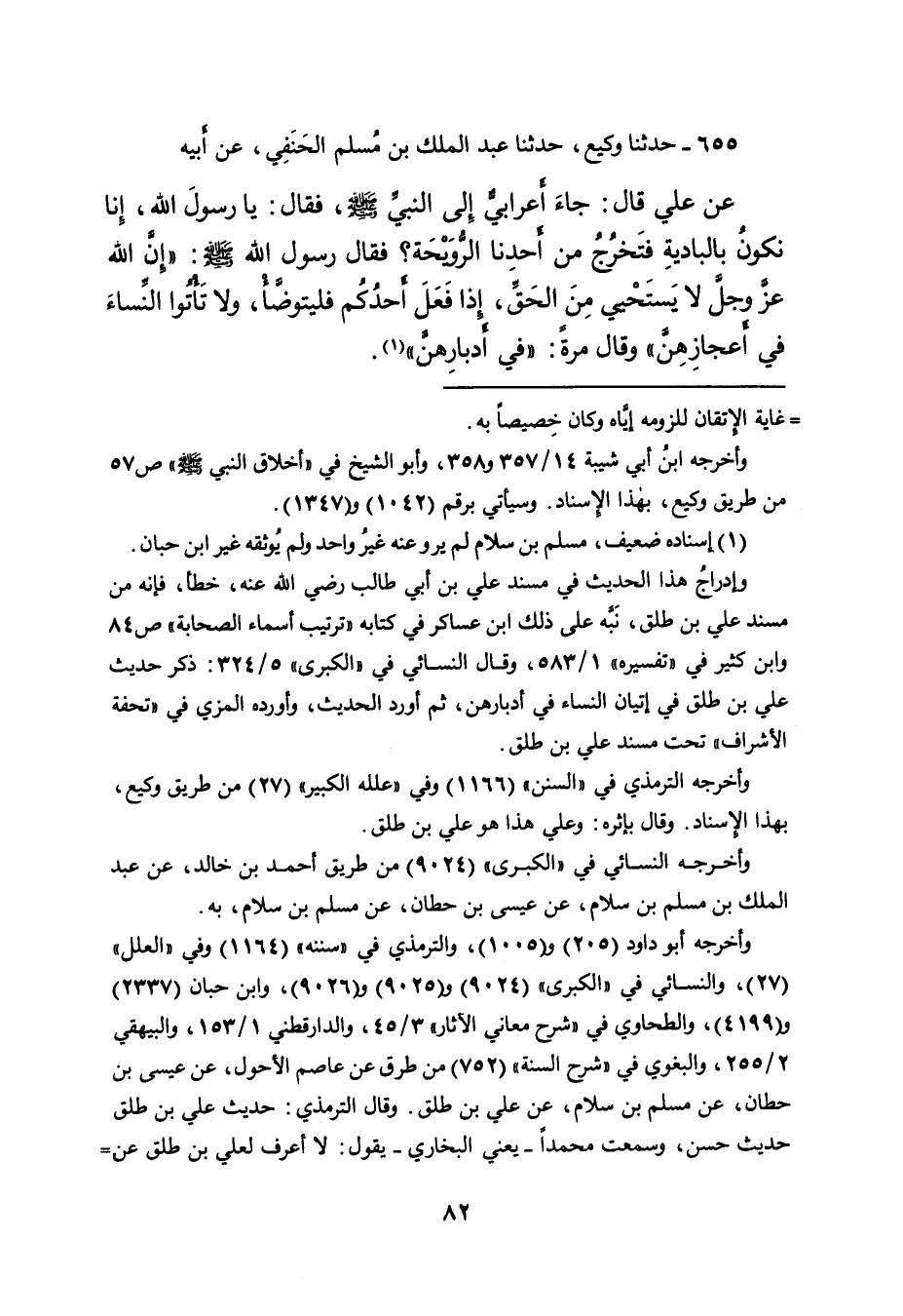 ٦٥٥ - حَدَّثَنَا وَكِيعٌ، حَدَّثَنَا عَبْدُ الْمَلِكِ بْنُ مُسْلِمٍ الْحَنَفِيُّ، عَنْ أَبِيهِ، عَنْ عَلِيٍّ، قَالَ: جَاءَ أَعْرَابِيٌّ إِلَى النَّبِيِّ صَلَّى اللهُ عَلَيْهِ وَسَلَّمَ، فَقَالَ: يَا رَسُولَ اللهِ، إِنَّا نَكُونُ بِالْبَادِيَةِ فَتَخْرُجُ مِنْ أَحَدِنَا الرُّوَيْحَةُ؟ فَقَالَ رَسُولُ اللهِ صَلَّى اللهُ عَلَيْهِ وَسَلَّمَ: " إِنَّ اللهَ عَزَّ وَجَلَّ لَا يَسْتَحْيِي مِنَ الْحَقِّ، إِذَا فَعَلَ أَحَدُكُمْ فَلْيَتَوَضَّأْ، وَلا تَأْتُوا النِّسَاءَ فِي أَعْجَازِهِنَّ " وَقَالَ مَرَّةً: " فِي أَدْبَارِهِنَّ " (١)