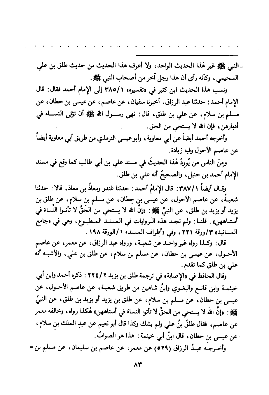 ونسب هذا الحديث ابن كثير في "تفسيره" ١/٣٨٥ إلى الإمام أحمد فقال: قال الإمام أحمد: حدثنا عبد الرزاق، أخبرنا سفيان، عن عاصم، عن عيسى بن حطان، عن مسلم بن سلام، عن علي بن طلق، قال: نهى رسول الله صَلَّى اللهُ عَلَيْهِ وَسَلَّمَ أن تؤتى النساء في أدبارهن، فإن الله لا يستحي من الحق.