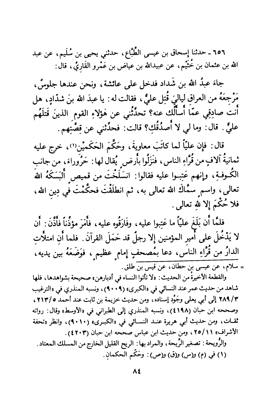 ٦٥٦ - حَدَّثَنَا إِسْحَاقُ بْنُ عِيسَى الطَّبَّاعُ، حَدَّثَنِي يَحْيَى بْنُ سُلَيْمٍ، عَنْ عَبْدِ اللهِ بْنِ عُثْمَانَ بْنِ خُثَيْمٍ، عَنْ عُبَيْدِ اللهِ بْنِ عِيَاضِ بْنِ عَمْرٍو الْقَارِيِّ قَالَ: جَاءَ عَبْدُ اللهِ بْنُ شَدَّادٍ، فَدَخَلَ عَلَى عَائِشَةَ، وَنَحْنُ عِنْدَهَا جُلُوسٌ، مَرْجِعَهُ مِنَ الْعِرَاقِ لَيَالِيَ قُتِلَ عَلِيٌّ، فَقَالَتْ لَهُ: يَا عَبْدَ اللهِ بْنَ شَدَّادٍ، هَلْ أَنْتَ صَادِقِي عَمَّا أَسْأَلُكَ عَنْهُ؟ تُحَدِّثُنِي عَنْ هَؤُلَاءِ الْقَوْمِ الَّذِينَ قَتَلَهُمْ عَلِيٌّ، قَالَ: وَمَا لِي لَا أَصْدُقُكِ؟ قَالَتْ: فَحَدِّثْنِي عَنْ قِصَّتِهِمْ قَالَ: فَإِنَّ عَلِيًّا لَمَّا كَاتَبَ مُعَاوِيَةَ، وَحَكَّمَ الْحَكَمَيْنِ (١) ، خَرَجَ عَلَيْهِ ثَمَانِيَةُ آلافٍ مِنْ قُرَّاءِ النَّاسِ، فَنَزَلُوا بِأَرْضٍ يُقَالُ لَهَا: حَرُورَاءُ، مِنْ جَانِبِ الْكُوفَةِ، وَإِنَّهُمْ عَتَبُوا عَلَيْهِ فَقَالُوا: انْسَلَخْتَ مِنْ قَمِيصٍ أَلْبَسَكَهُ اللهُ تَعَالَى، وَاسْمٍ سَمَّاكَ اللهُ تَعَالَى بِهِ، ثُمَّ انْطَلَقْتَ فَحَكَّمْتَ فِي دِينِ اللهِ، فَلا حُكْمَ إِلا لِلَّهِ تَعَالَى. فَلَمَّا أَنْ بَلَغَ عَلِيًّا مَا عَتَبُوا عَلَيْهِ، وَفَارَقُوهُ عَلَيْهِ، فَأَمَرَ مُؤَذِّنًا فَأَذَّنَ: أَنْ لَا يَدْخُلَ عَلَى أَمِيرِ الْمُؤْمِنِينَ إِلا رَجُلٌ قَدْ حَمَلَ الْقُرْآنَ. فَلَمَّا أَنِ امْتَلاتِ الدَّارُ مِنْ قُرَّاءِ النَّاسِ، دَعَا بِمُصْحَفٍ إِمَامٍ عَظِيمٍ، فَوَضَعَهُ بَيْنَ يَدَيْهِ،