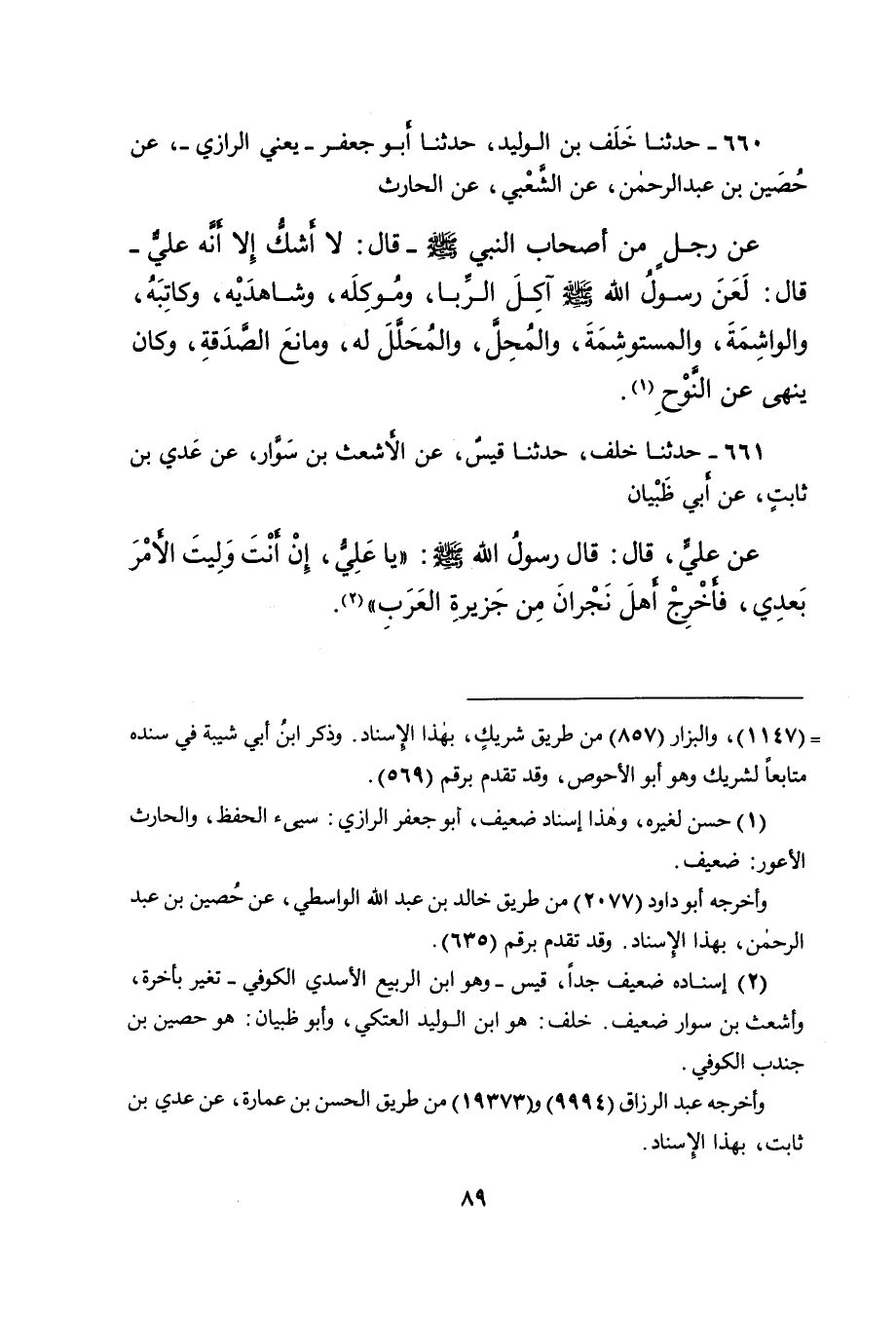 ٦٦١ - حَدَّثَنَا خَلَفٌ، حَدَّثَنَا قَيْسٌ، عَنِ الْأَشْعَثِ بْنِ سَوَّارٍ، عَنْ عَدِيِّ بْنِ ثَابِتٍ، عَنْ أَبِي ظَبْيَانَ، عَنْ عَلِيٍّ، قَالَ: قَالَ رَسُولُ اللهِ صَلَّى اللهُ عَلَيْهِ وَسَلَّمَ: " يَا عَلِيُّ، إِنْ أَنْتَ وُلِّيتَ الْأَمْرَ بَعْدِي، فَأَخْرِجْ أَهْلَ نَجْرَانَ مِنْ جَزِيرَةِ الْعَرَبِ " (٢)