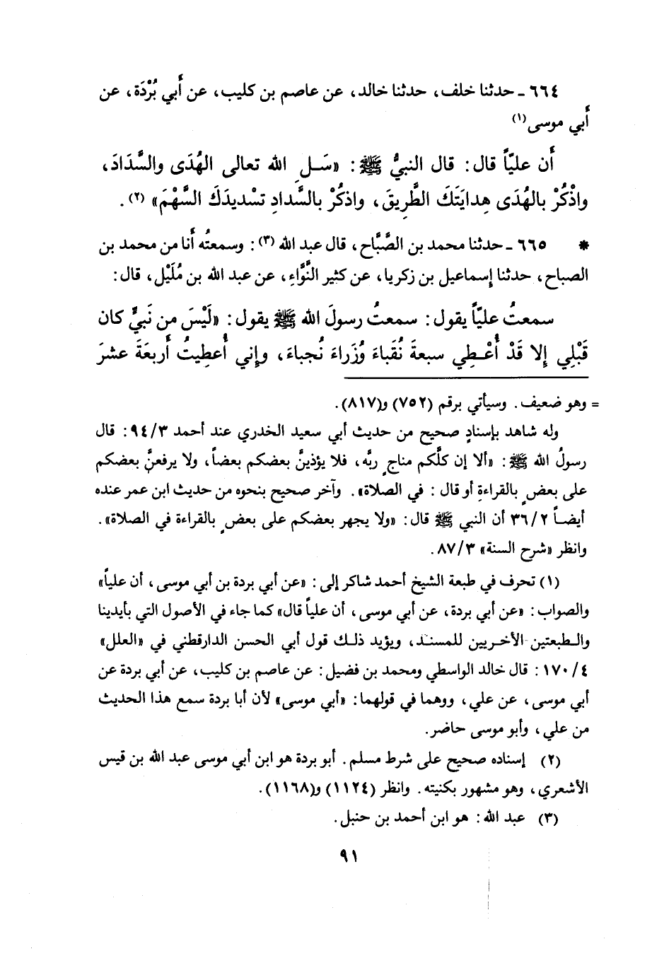 • ٦٦٥ - حَدَّثَنَا مُحَمَّدُ بْنُ الصَّبَّاحِ، قَالَ: عَبْدُ اللهِ (٣) : وَسَمِعْتُهُ أَنَا مِنْ، مُحَمَّدِ بْنِ الصَّبَّاحِ، حَدَّثَنَا إِسْمَاعِيلُ بْنُ زَكَرِيَّا، عَنْ كَثِيرٍ النَّوَّاءِ، عَنْ عَبْدِ اللهِ بْنِ مُلَيْلٍ، قَالَ: سَمِعْتُ عَلِيًّا، يَقُولُ: سَمِعْتُ رَسُولَ اللهِ صَلَّى اللهُ عَلَيْهِ وَسَلَّمَ يَقُولُ: " لَيْسَ مِنْ نَبِيٍّ كَانَ قَبْلِي إِلا قَدْ أُعْطِيَ سَبْعَةَ نُقَبَاءَ وُزَرَاءَ نُجَبَاءَ، وَإِنِّي أُعْطِيتُ أَرْبَعَةَ عَشَرَ
