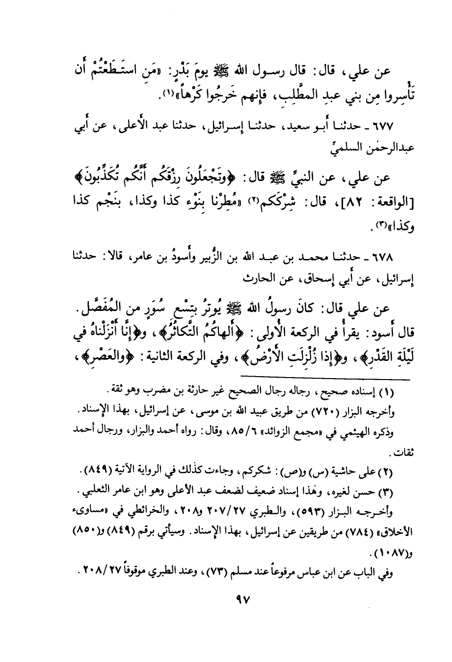 ٦٧٨ - حَدَّثَنَا مُحَمَّدُ بْنُ عَبْدِ اللهِ بْنِ الزُّبَيْرِ، وَأَسْوَدُ بْنُ عَامِرٍ، قَالا: حَدَّثَنَا إِسْرَائِيلُ، عَنْ أَبِي إِسْحَاقَ، عَنِ الْحَارِثِ، عَنْ عَلِيٍّ، قَالَ: " كَانَ رَسُولُ اللهِ صَلَّى اللهُ عَلَيْهِ وَسَلَّمَ يُوتِرُ بِتِسْعِ سُوَرٍ مِنَ الْمُفَصَّلِ " قَالَ أَسْوَدُ: " يَقْرَأُ فِي الرَّكْعَةِ الْأُولَى: أَلْهَاكُمِ التَّكَاثُرُ، وَإِنَّا أَنْزَلْنَاهُ فِي لَيْلَةِ الْقَدْرِ، وَإِذَا زُلْزِلَتِ الْأَرْضُ، وَفِي الرَّكْعَةِ الثَّانِيَةِ: وَالْعَصْرِ،