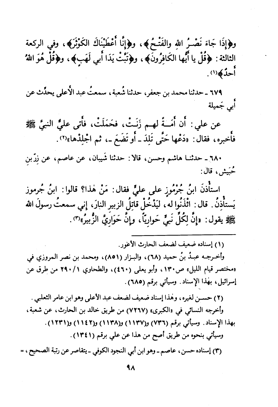 ٦٨٠ - حَدَّثَنَا هَاشِمٌ، وَحَسَنٌ، قَالا: حَدَّثَنَا شَيْبَانُ، عَنْ عَاصِمٍ، عَنْ زِرِّ بْنِ حُبَيْشٍ، قَالَ: اسْتَأْذَنَ ابْنُ جُرْمُوزٍ عَلَى عَلِيٍّ فَقَالَ: مَنْ هَذَا؟ قَالُوا: ابْنُ جُرْمُوزٍ يَسْتَأْذِنُ. قَالَ: ائْذَنُوا لَهُ، لِيَدْخُلْ قَاتِلُ الزُّبَيْرِ النَّارَ، إِنِّي سَمِعْتُ رَسُولَ اللهِ صَلَّى اللهُ عَلَيْهِ وَسَلَّمَ يَقُولُ: " إِنَّ لِكُلِّ نَبِيٍّ حَوَارِيًّا، وَإِنَّ حَوَارِيَّ الزُّبَيْرُ " (٣)