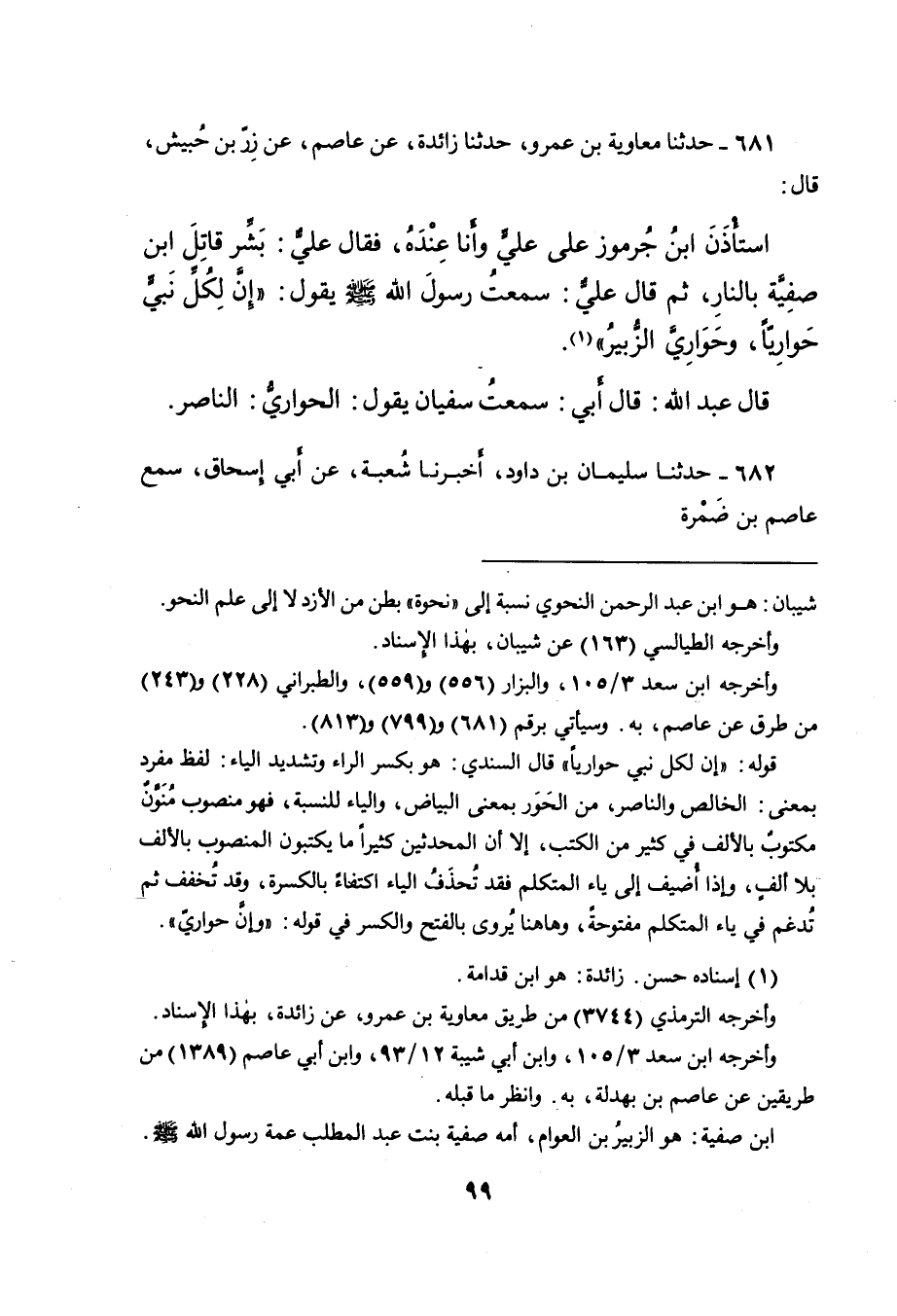 ٦٨١ - حَدَّثَنَا مُعَاوِيَةُ بْنُ عَمْرٍو، حَدَّثَنَا زَائِدَةُ، عَنْ عَاصِمٍ، عَنْ زِرِّ بْنِ حُبَيْشٍ، قَالَ: اسْتَأْذَنَ ابْنُ جُرْمُوزٍ عَلَى عَلِيٍّ وَأَنَا عِنْدَهُ، فَقَالَ عَلِيٌّ: بَشِّرْ قَاتِلَ ابْنِ صَفِيَّةَ بِالنَّارِ، ثُمَّ قَالَ عَلِيٌّ: سَمِعْتُ رَسُولَ اللهِ صَلَّى اللهُ عَلَيْهِ وَسَلَّمَ يَقُولُ: " إِنَّ لِكُلِّ نَبِيٍّ حَوَارِيًّا، وَحَوَارِيَّ الزُّبَيْرُ " (١) قَالَ عَبْدُ اللهِ: قَالَ أَبِي: سَمِعْتُ سُفْيَانَ يَقُولُ: " الْحَوَارِيُّ: النَّاصِرُ "