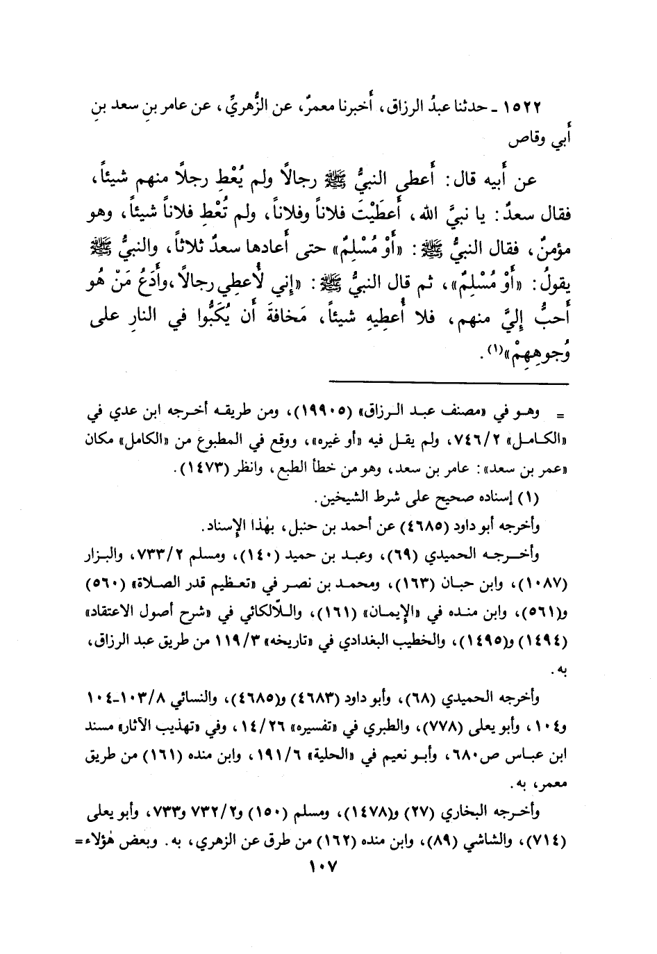 ١٥٢٢ - حَدَّثَنَا عَبْدُ الرَّزَّاقِ، أَخْبَرَنَا مَعْمَرٌ، عَنِ الزُّهْرِيِّ، عَنْ عَامِرِ بْنِ سَعْدِ بْنِ أَبِي وَقَّاصٍ، عَنْ أَبِيهِ، قَالَ: أَعْطَى النَّبِيُّ صَلَّى اللهُ عَلَيْهِ وَسَلَّمَ رِجَالًا، وَلَمْ يُعْطِ رَجُلًا مِنْهُمْ شَيْئًا، فَقَالَ سَعْدٌ: يَا نَبِيَّ اللهِ، أَعْطَيْتَ فُلانًا وَفُلانًا وَلَمْ تُعْطِ فُلانًا شَيْئًا وَهُوَ مُؤْمِنٌ، فَقَالَ النَّبِيُّ صَلَّى اللهُ عَلَيْهِ وَسَلَّمَ: " أَوْ مُسْلِمٌ " حَتَّى أَعَادَهَا سَعْدٌ ثَلاثًا، وَالنَّبِيُّ صَلَّى اللهُ عَلَيْهِ وَسَلَّمَ يَقُولُ: " أَوْ مُسْلِمٌ " ثُمَّ قَالَ النَّبِيُّ صَلَّى اللهُ عَلَيْهِ وَسَلَّمَ: " إِنِّي لأعْطِي رِجَالًا، وَأَدَعُ مَنْ هُوَ أَحَبُّ إِلَيَّ مِنْهُمْ فَلا أُعْطِيهِ شَيْئًا، مَخَافَةَ أَنْ يُكَبُّوا فِي النَّارِ عَلَى وُجُوهِهِمْ " (١)