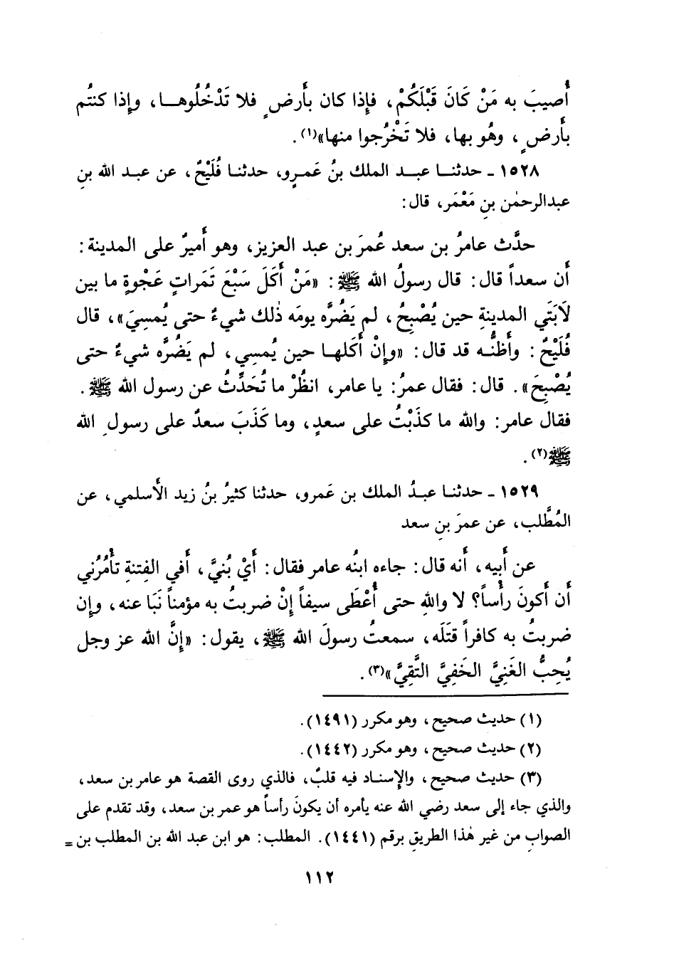 ١٥٢٨ - حَدَّثَنَا عَبْدُ الْمَلِكِ بْنُ عَمْرٍو، حَدَّثَنَا فُلَيْحٌ، عَنْ عَبْدِ اللهِ بْنِ عَبْدِ الرَّحْمَنِ بْنِ مَعْمَرٍ، قَالَ: حَدَّثَ عَامِرُ بْنُ سَعْدٍ، عُمَرَ بْنَ عَبْدِ الْعَزِيزِ وَهُوَ أَمِيرٌ عَلَى الْمَدِينَةِ: أَنَّ سَعْدًا قَالَ: قَالَ رَسُولُ اللهِ صَلَّى اللهُ عَلَيْهِ وَسَلَّمَ: " مَنِ أكَلَ سَبْعَ تَمَرَاتِ عَجْوَةٍ مَا بَيْنَ لابَتَيْ الْمَدِينَةِ حِينَ يُصْبِحُ، لَمْ يَضُرَّهُ يَوْمَهُ ذَلِكَ شَيْءٌ حَتَّى يُمْسِيَ " قَالَ فُلَيْحٌ: وَأَظُنُّهُ قَدْ قَالَ: " وَإِنِ أكَلَهَا حِينَ يُمْسِي لَمْ يَضُرَّهُ شَيْءٌ حَتَّى يُصْبِحَ ". قَالَ: فَقَالَ عُمَرُ: يَا عَامِرُ، انْظُرْ مَا تُحَدِّثُ عَنْ رَسُولِ اللهِ صَلَّى اللهُ عَلَيْهِ وَسَلَّمَ، فَقَالَ عَامِرٌ: وَاللهِ مَا كَذَبْتُ عَلَى سَعْدٍ، وَمَا كَذَبَ سَعْدٌ عَلَى رَسُولِ اللهِ صَلَّى اللهُ عَلَيْهِ وَسَلَّمَ (٢)