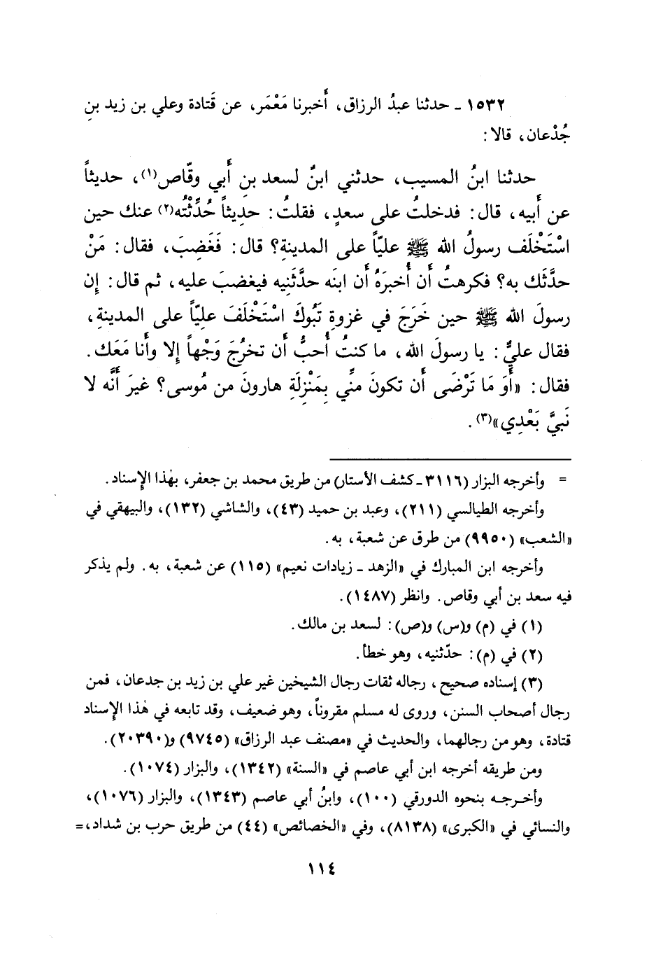 ١٥٣٢ - حَدَّثَنَا عَبْدُ الرَّزَّاقِ، أَخْبَرَنَا مَعْمَرٌ، عَنْ قَتَادَةَ، وَعَلِيِّ بْنِ زَيْدِ بْنِ جُدْعَانَ، قَالَا: حَدَّثَنَا ابْنُ الْمُسَيِّبِ، حَدَّثَنِي ابْنٌ لِسَعْدِ بْنِ أَبِي وَقَّاصٍ (١) ، حَدِيثًا عَنْ أَبِيهِ، قَالَ: دَخَلْتُ عَلَى سَعْدٍ فَقُلْتُ: حَدِيثًا حُدِّثْتُهُ (٢) عَنْكَ، حِينَ اسْتَخْلَفَ رَسُولُ اللهِ صَلَّى اللهُ عَلَيْهِ وَسَلَّمَ عَلِيًّا عَلَى الْمَدِينَةِ، قَالَ: فَغَضِبَ، فَقَالَ: مَنْ حَدَّثَكَ بِهِ؟ فَكَرِهْتُ أَنْ أُخْبِرَهُ أَنَّ ابْنَهُ حَدَّثَنِيهِ فَيَغْضَبَ عَلَيْهِ، ثُمَّ قَالَ: إِنَّ رَسُولَ اللهِ صَلَّى اللهُ عَلَيْهِ وَسَلَّمَ حِينَ خَرَجَ فِي غَزْوَةِ تَبُوكَ، اسْتَخْلَفَ عَلِيًّا عَلَى الْمَدِينَةِ فَقَالَ عَلِيٌّ: يَا رَسُولَ اللهِ، مَا كُنْتُ أُحِبُّ أَنْ تَخْرُجَ وَجْهًا إِلا وَأَنَا مَعَكَ، فَقَالَ: " أَوَمَا تَرْضَى أَنْ تَكُونَ مِنِّي بِمَنْزِلَةِ هَارُونَ مِنْ مُوسَى، غَيْرَ أَنَّهُ لَا نَبِيَّ بَعْدِي " (٣)