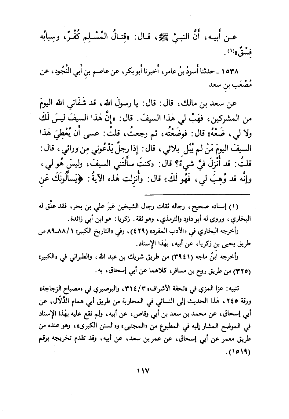 ١٥٣٨ - حَدَّثَنَا أَسْوَدُ بْنُ عَامِرٍ، أَخْبَرَنَا أَبُو بَكْرٍ، عَنْ عَاصِمِ بْنِ أَبِي النَّجُودِ، عَنْ مُصْعَبِ بْنِ سَعْدٍ، عَنْ سَعْدِ بْنِ مَالِكٍ، قَالَ: قَالَ: يَا رَسُولَ اللهِ، قَدْ شَفَانِي اللهُ الْيَوْمَ مِنَ المُشْرِكِينَ، فَهَبْ لِي هَذَا السَّيْفُ. قَالَ: " إِنَّ هَذَا السَّيْفَ لَيْسَ لَكَ وَلا لِي ضَعْهُ " قَالَ: فَوَضَعْتُهُ. ثُمَّ رَجَعْتُ، قُلْتُ: عَسَى أَنْ يُعْطَى هَذَا السَّيْفُ الْيَوْمَ مَنْ لَمْ يُبْلِ بَلائِي، قَالَ: إِذَا رَجُلٌ يَدْعُونِي مِنْ وَرَائِي قَالَ: قُلْتُ: قَدِ أنْزِلَ فِيَّ شَيْءٌ؟ قَالَ: " كُنْتَ سَأَلْتَنِي السَّيْفَ، وَلَيْسَ هُوَ لِي، وَإِنَّهُ قَدْ وُهِبَ لِي، فَهُوَ لَكَ " قَالَ: وَأُنْزِلَتْ هَذِهِ الْآيَةُ: {يَسْأَلُونَكَ عَنِ