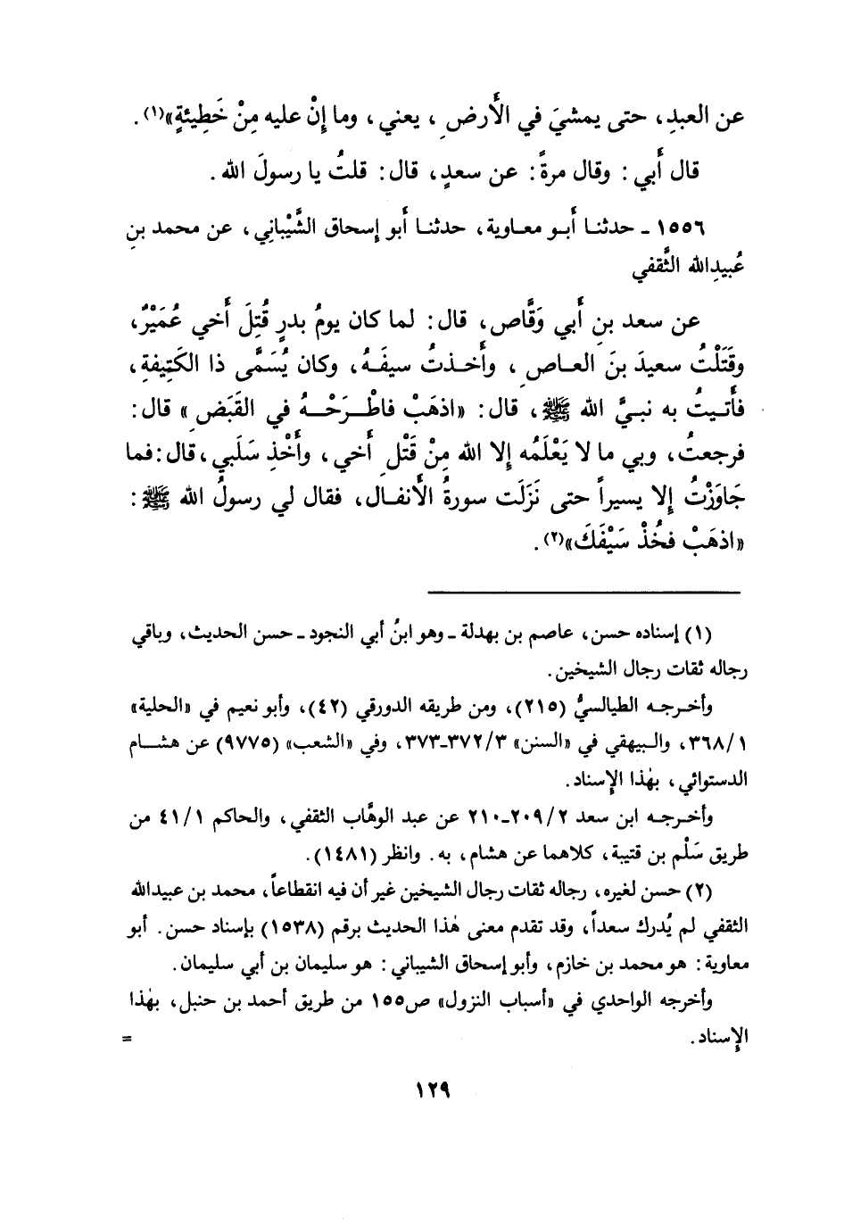 ١٥٥٦ - حَدَّثَنَا أَبُو مُعَاوِيَةَ، حَدَّثَنَا أَبُو إِسْحَاقَ الشَّيْبَانِيُّ، عَنْ مُحَمَّدِ بْنِ عُبَيْدِ اللهِ الثَّقَفِيِّ، عَنْ سَعْدِ بْنِ أَبِي وَقَّاصٍ، قَالَ: لَمَّا كَانَ يَوْمُ بَدْرٍ قُتِلَ أَخِي عُمَيْرٌ، وَقَتَلْتُ سَعِيدَ بْنَ الْعَاصِ، وَأَخَذْتُ سَيْفَهُ، وَكَانَ يُسَمَّى ذَا الْكَتِيفَةِ، فَأَتَيْتُ بِهِ نَبِيَّ اللهِ صَلَّى اللهُ عَلَيْهِ وَسَلَّمَ قَالَ: " اذْهَبْ فَاطْرَحْهُ فِي الْقَبَضِ " قَالَ: فَرَجَعْتُ وَبِي مَا لَا يَعْلَمُهُ إِلا اللهُ مِنْ قَتْلِ أَخِي، وَأَخْذِ سَلَبِي، قَالَ: فَمَا جَاوَزْتُ إِلا يَسِيرًا حَتَّى نَزَلَتْ سُورَةُ الْأَنْفَالِ، فَقَالَ لِي رَسُولُ اللهِ صَلَّى اللهُ عَلَيْهِ وَسَلَّمَ: " اذْهَبْ فَخُذْ سَيْفَكَ " (٢)